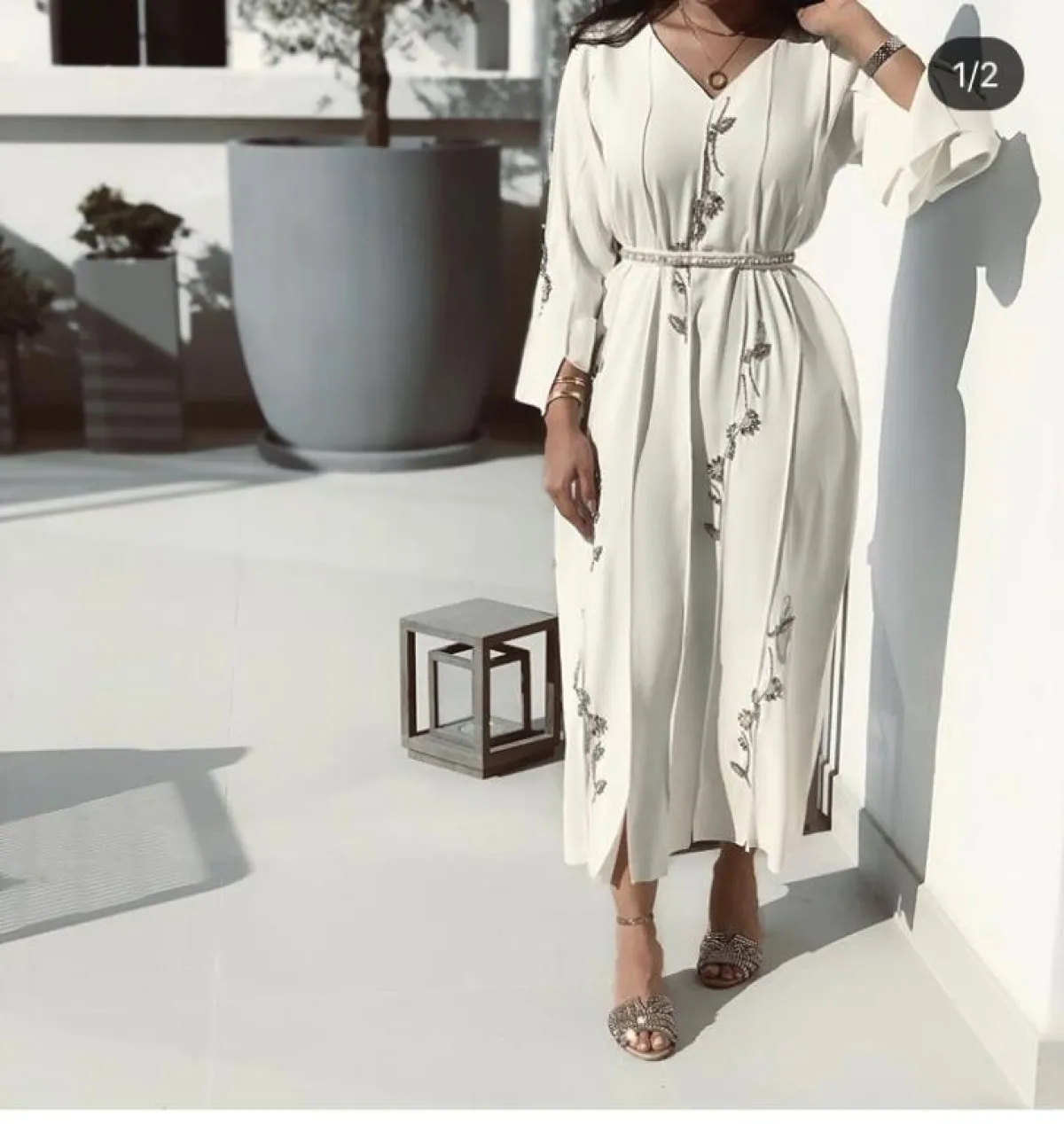 يمكنك اعتماد هذا الموديل الأبيض للعباية الفستان مع حزام الخصر المترف من اللؤلؤ، مع لمسة بسيطة من تطريزات الورود، أنيق ومميز ويبرز رشاقة الصبية، مناسب أكثر لحفلات المساء، أو مناسبات ما بعد الظهر، خاصة مع الكعب العالي.