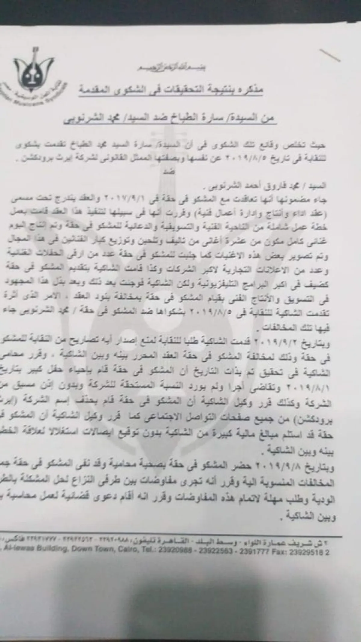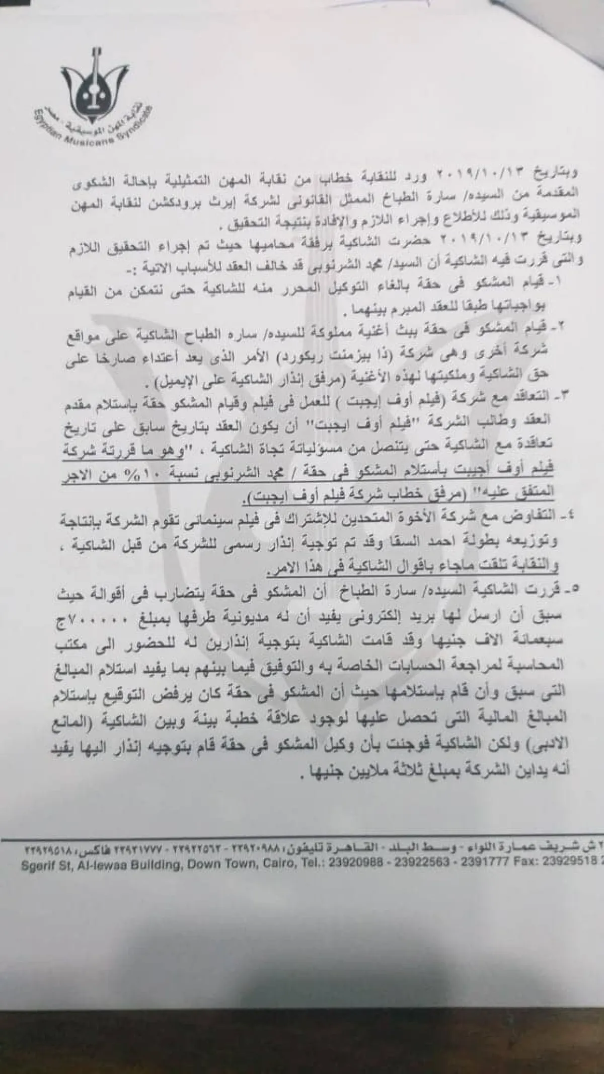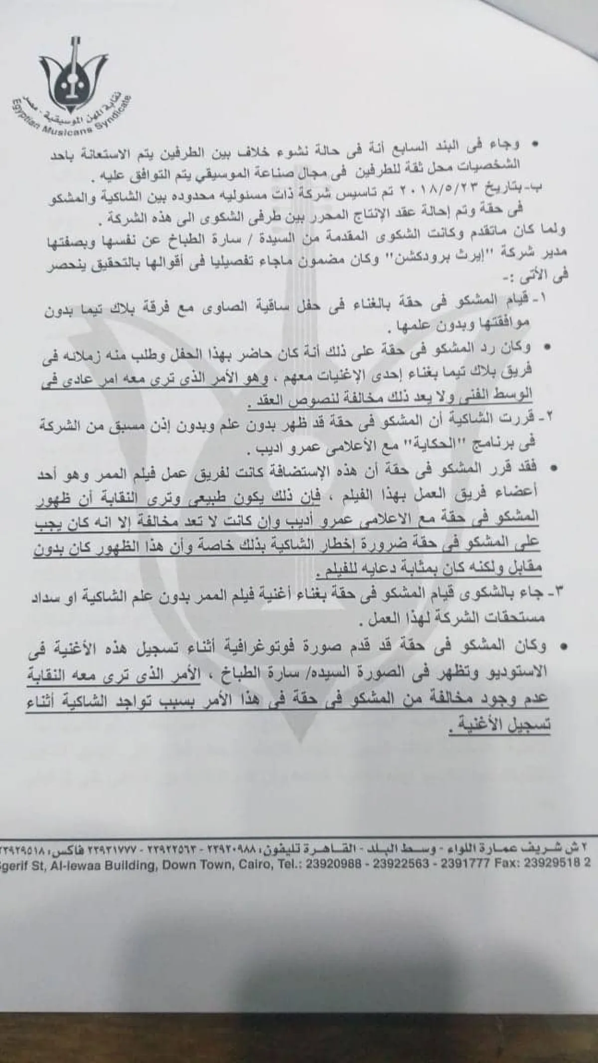 واشتكت المنتجة سارة الطباخ المطرب الشاب للنقابة لعدم التزامه لتنفيذ عقد الاتفاق المبرم بينهما، ونظرت النقابة هذا النزاع في ضوء أقوال الشاكية والمشكو في حقه وفي ضوء المستندات المقدمة من كل منهما، وعقب ذلك قررت لجنة التحقيق التوصية بوقف المطرب لحين حل النزاع وديا أو قضائيا.