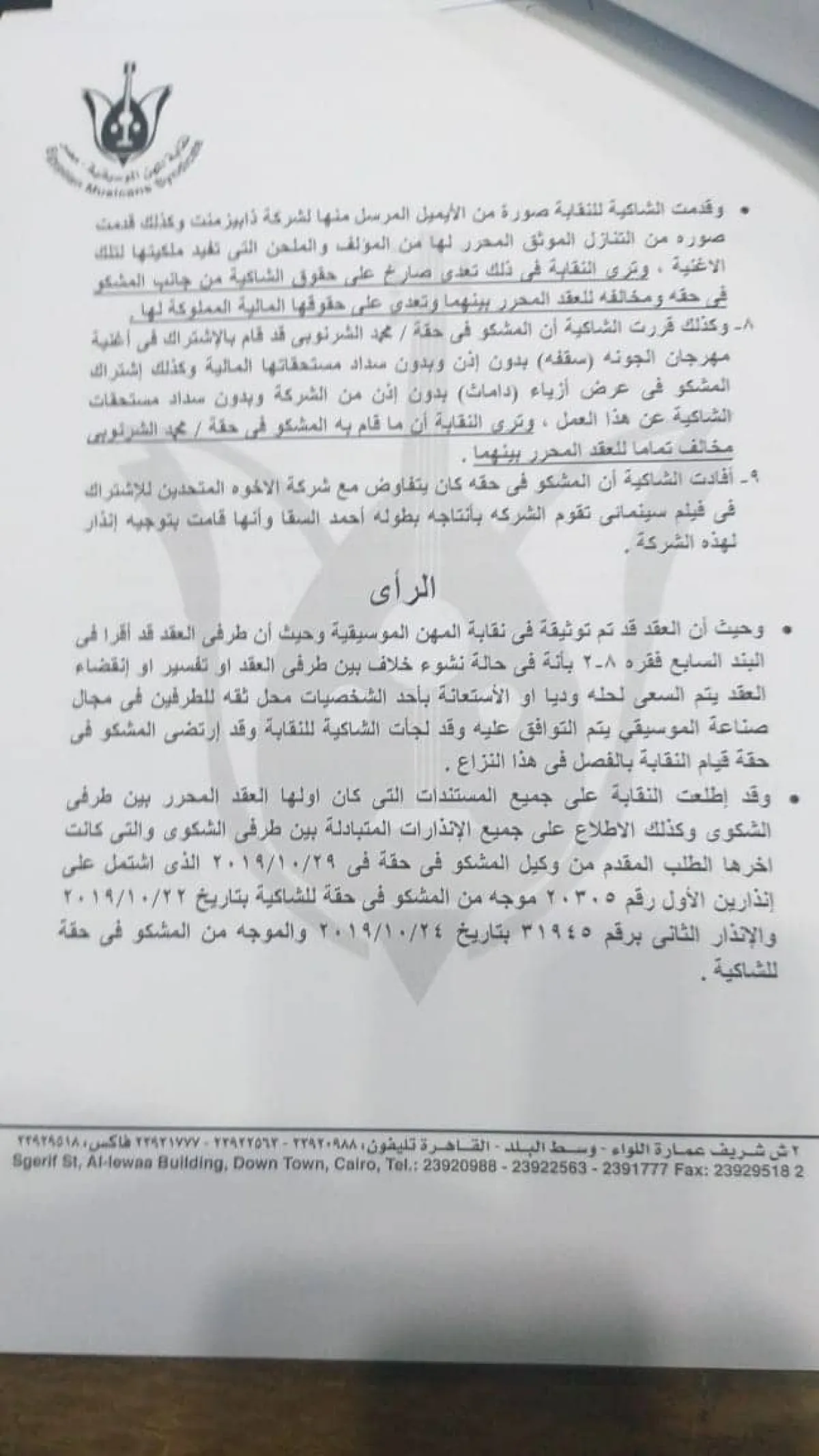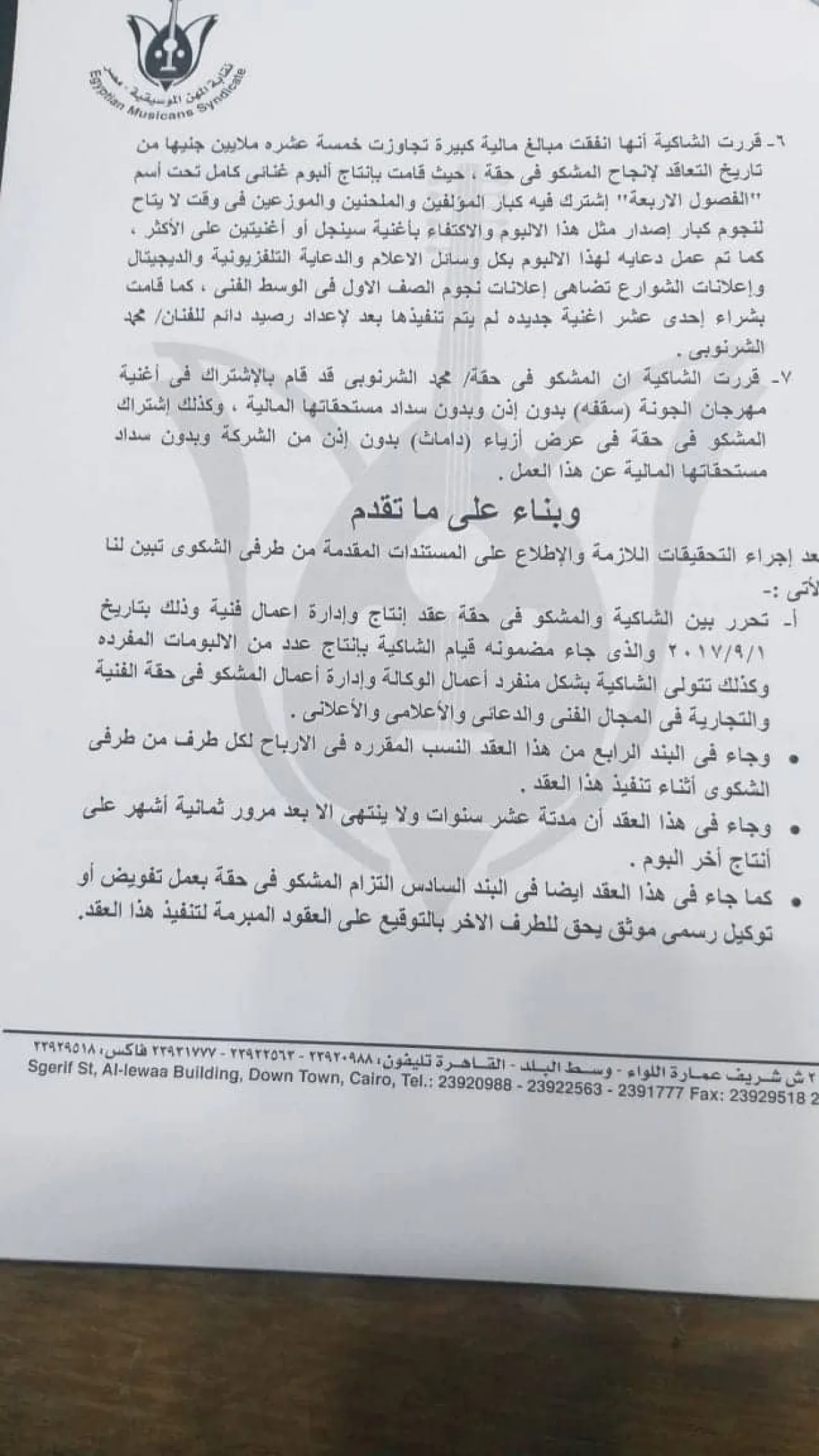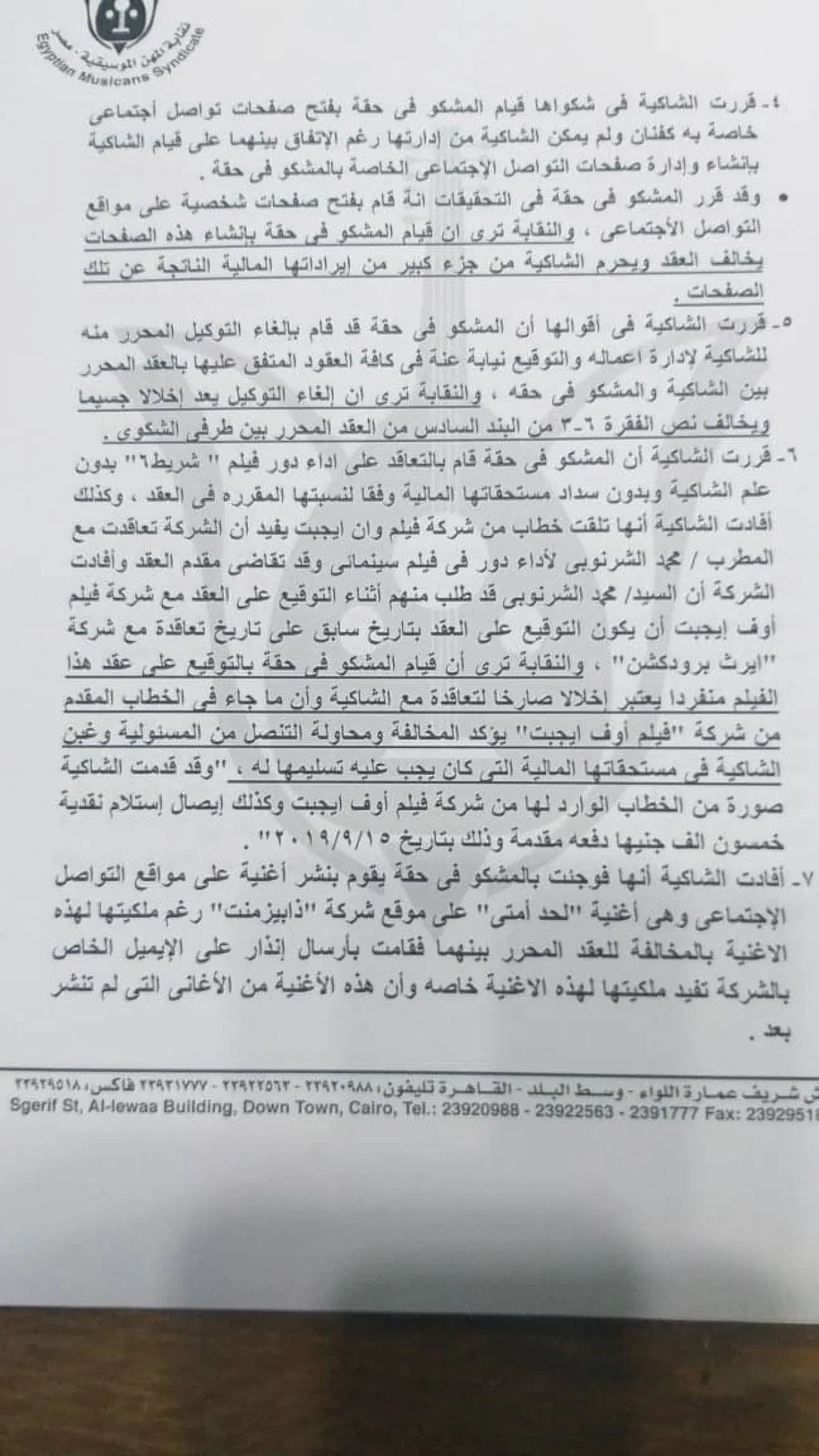 واشتكت المنتجة سارة الطباخ المطرب الشاب للنقابة لعدم التزامه لتنفيذ عقد الاتفاق المبرم بينهما، ونظرت النقابة هذا النزاع في ضوء أقوال الشاكية والمشكو في حقه وفي ضوء المستندات المقدمة من كل منهما، وعقب ذلك قررت لجنة التحقيق التوصية بوقف المطرب لحين حل النزاع وديا أو قضائيا.