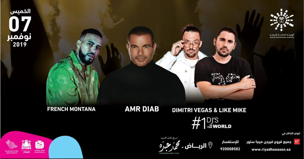 يستعد المطرب عمرو دياب لإحياء أول حفل غنائي له ضمن احتفالات موسم الرياض يوم الخميس المقبل الموافق 7 نوفمبر، وتنظمه الهيئة العامة للترفيه، ويشارك خلال الحفل نفسه النجم العالمي فرينش مونتانا، والدي جي دميتري فيجاس والدي جي لايك مايك، وذلك على خشبة مسرح محمد عبده في الرياض.
