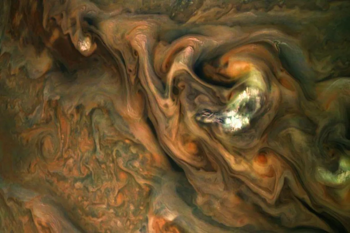 للوهلة الأولى في هذه الصورة، قد تظن أنها حليب يعوم في فنجان قهوة، لكن الدوامات الجميلة هي في الواقع منطقة مجرى السحب على كوكب المشترى، والتي التقطتها مركبة الفضاء «جونو» التابعة لناسا.