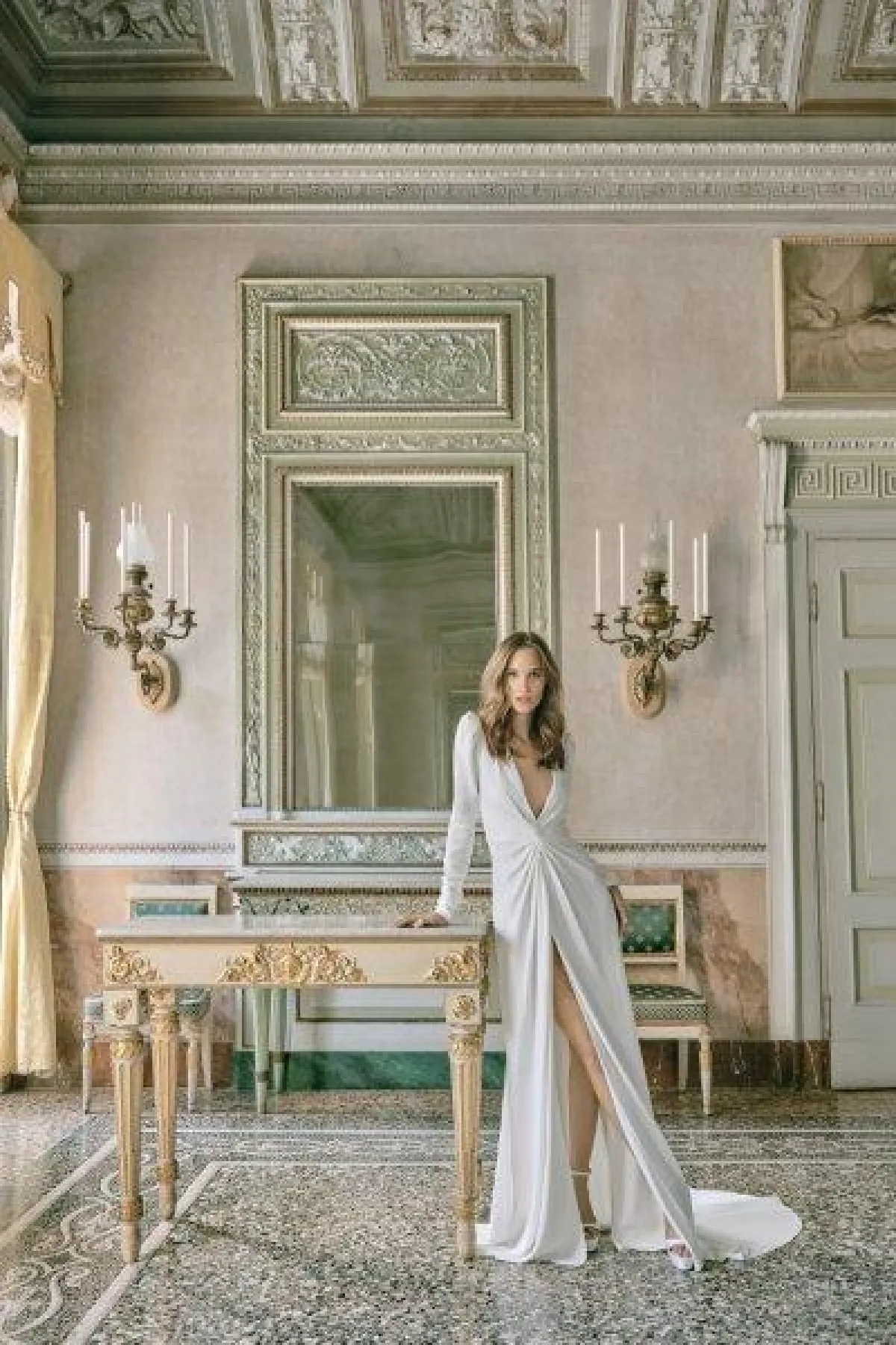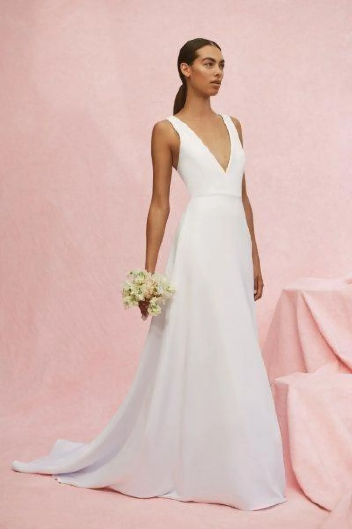 أيضاً قدمت ماركة Amsale فساتين زفاف بقبّة V سواء فساتين منفوشة أو عمودية، فضلاً عن الفساتين بالأكمام الطويلة والفساتين بدون أكمام.