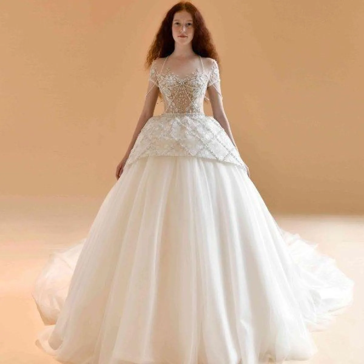 وبرزت صيحة الفساتين بالأكمام القصيرة مع التنورة المنفوشة، مثل فستان زفاف The Atelier المرصع بالفصوص البرّاقة على الصدر.
