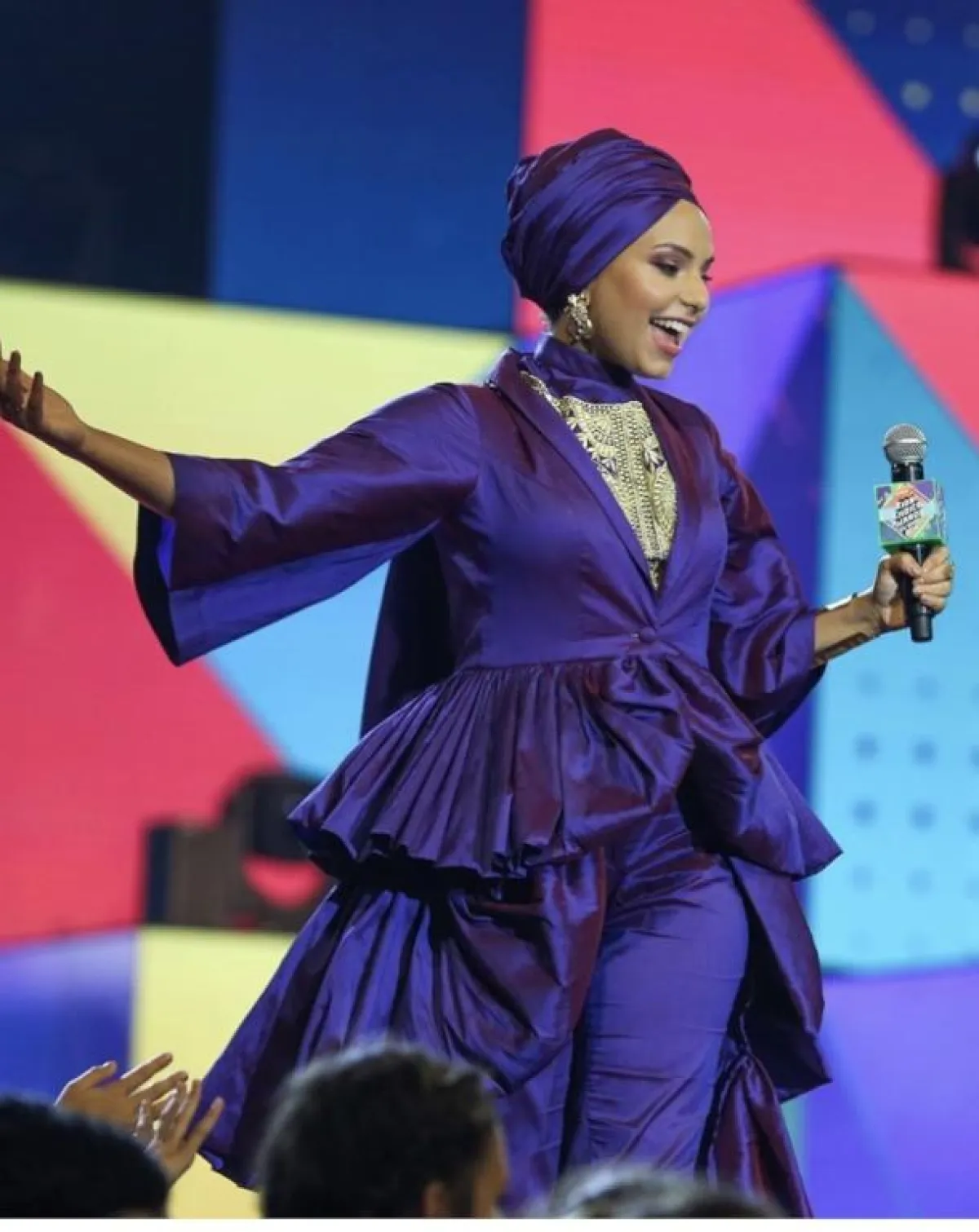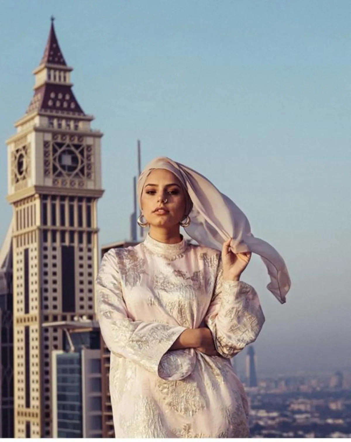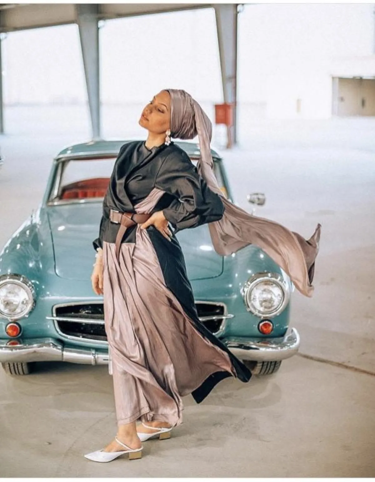 بطريقة ناعمة اعتمدت هيفاء لفة الحجاب البسيطة من الساتان المخملي، قامت بلفها بطريقة طبقية قليلًا، استخدمت فيها الحجاب الساتان الطويل، لكي تترك الطرف منسدلًا ومتطايرًا في الهواء، ليمنحها لوك عصريًّا، وهذا الحجاب ترتديه كثيرًا هيفاء بسيسو في الفترة الأخيرة، بخاصة مع اطلالتها ذات اللمسات الجنونية الجريئة، سواء بالألوان أو بالتصميمات.