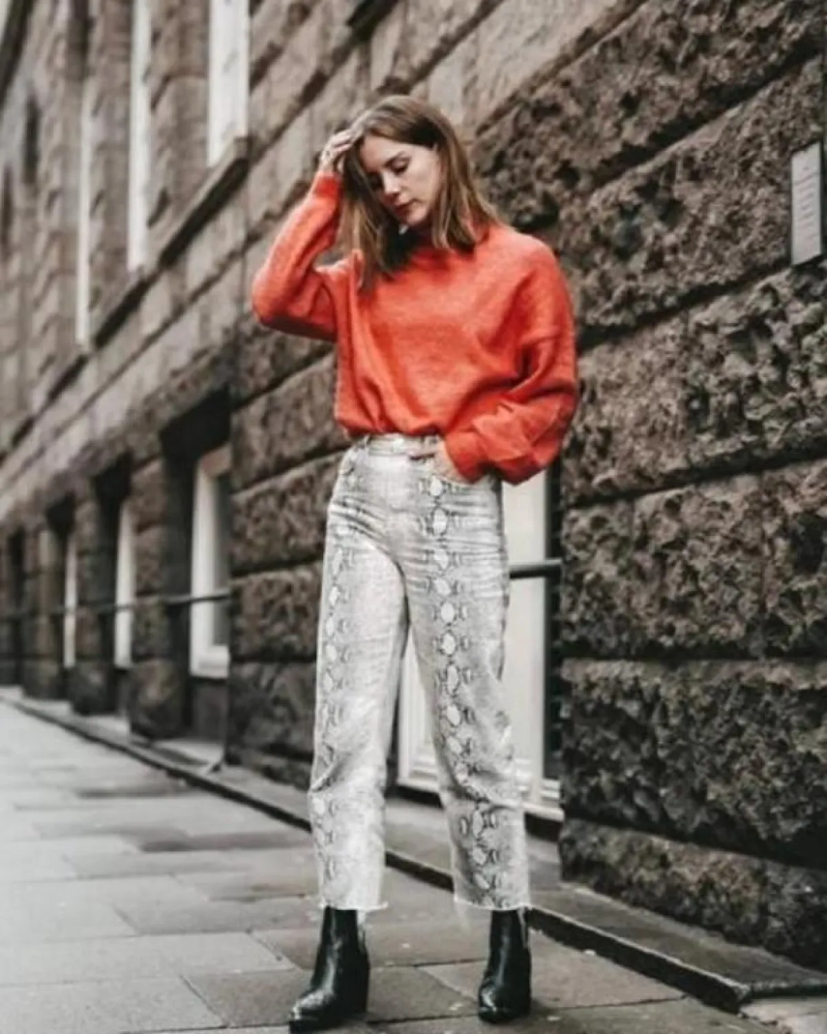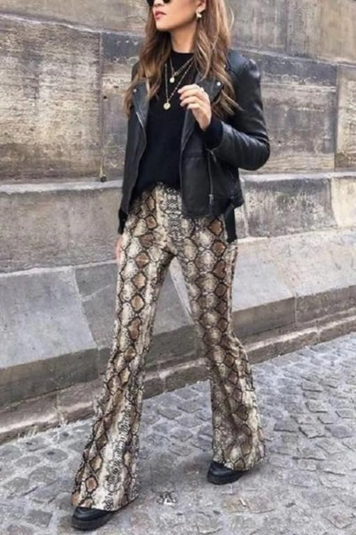 إن كنت تبحثين عن ستايل جديد لتتألقي به في الخريف والشتاء، فلا تتردي في اقتناء البنطلون المنقوش بجلد الثعبان، نسقي البنطلون المطبع بنقشة جلد الثعبان مع اللون الأبيض والأسود في البلوزات وكذلك الجواكت وستحصلين على لوك بسيط ومتجدد بشكل دائم، جربي أيضا بلوزة باللون البرتقالي مع بنطلون شارلستون بطبعة جلد الثعبان.