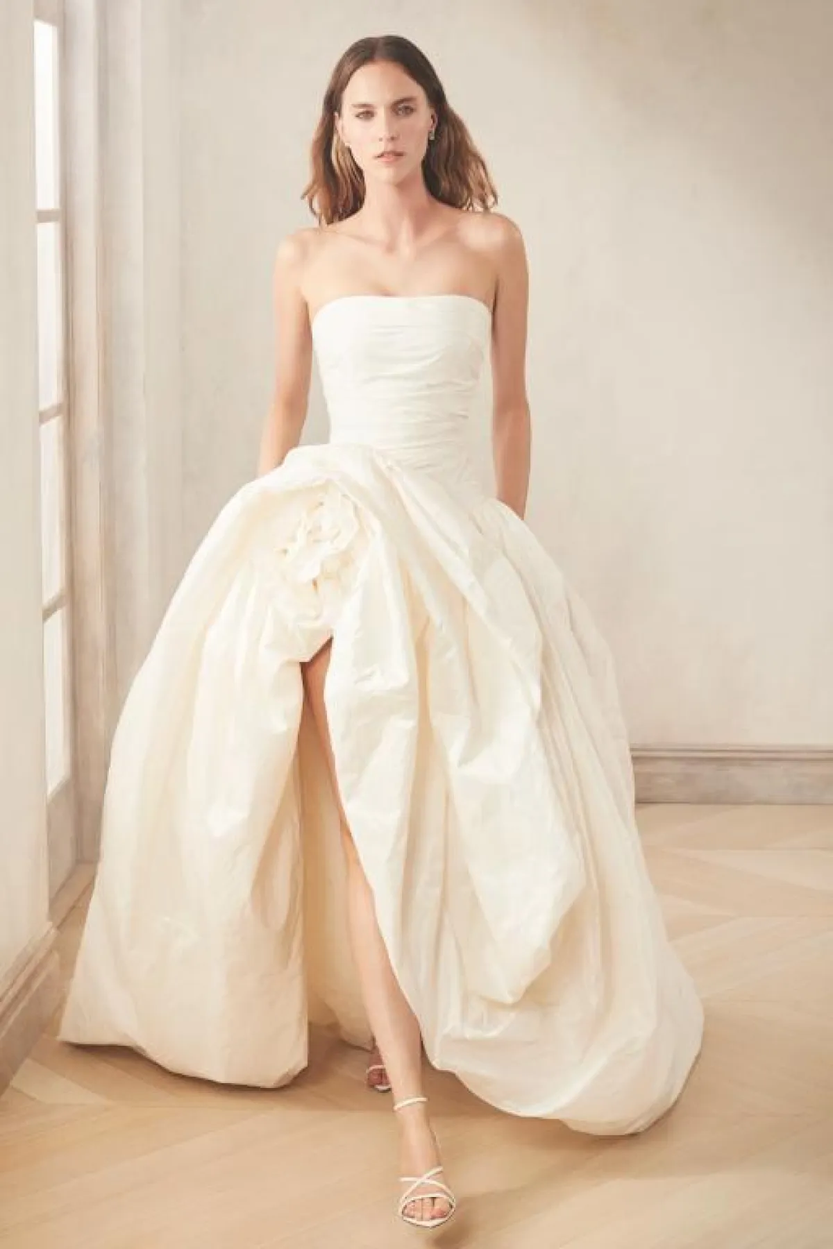 أما إذا كنتِ ترغبين بارتداء فستان منفوش وبالوقت نفسه تريدين إبراز ساقيكِ، أو مثلًا تتمتعين بقصر القامة، وترغبين بإضافة تفصيلة مختلفة تزيدكِ طولًا، فهذا الموديل من Oscar de la Renta أوسكار دو لارنتا، سوف يبدو مميزًا ومناسبًا لكِ باختيار الفستان الكريمي المنفوش مع فتحة الساق، ولا تنسي اختيار كعب عالٍ أنيق يلفت الأنظار، لأنّ موديل الفستان سيكشف جمال الكعب طوال الوقت.
