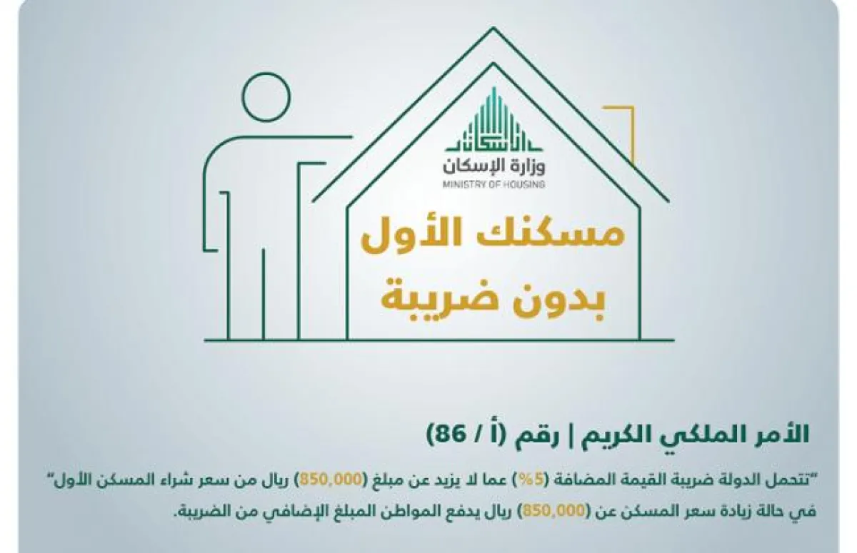 وكانت وزارة الإسكان قد أكدت في وقت سابق أن الدولة تتحمل ضريبة القيمة المضافة على المنزل الأول حتى 850 ألف ريال.
