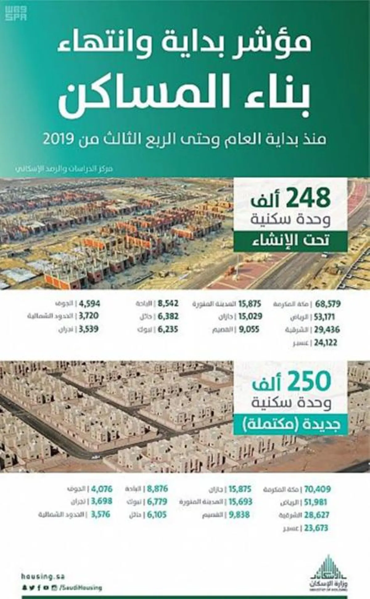 وفيما يتعلق بعدد الوحدات السكنية الجديدة المكتملة في المناطق للربع الثالث من 2019، فتأتي أيضاً منطقة مكة المكرمة في المقدمة بعدد 70.409 وحدة سكنية، تليها الرياض بـ 51.981 وحدة سكنية، كما تأتي المنطقة الشرقية ثالثة من حيث عدد الوحدات السكنية الجديدة "المكتملة" بـ28.627 وحدة سكنية.