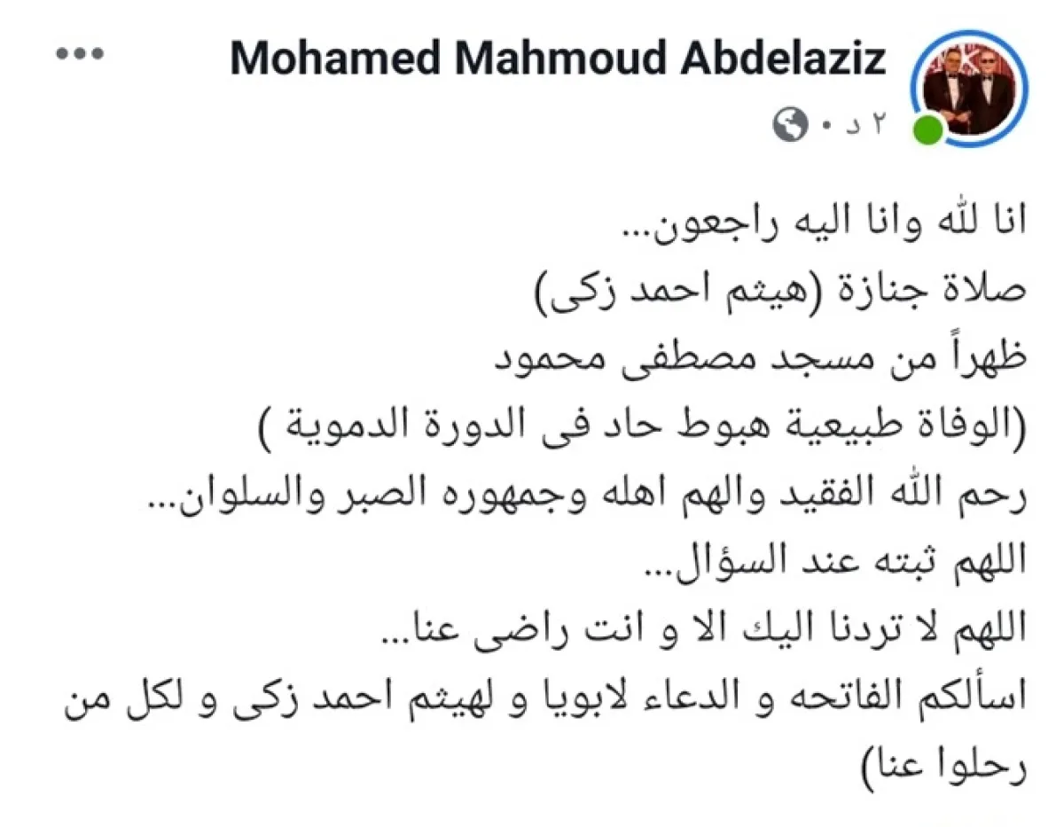 وقال محمد محمود عبد العزيز عبر صفحته الشخصية على موقع التواصل الاجتماعي الفيس بوك: "إنا لله وإنا إليه راجعون.. صلاة جنازة (هيثم أحمد زكى) ظهرا من مسجد مصطفى محمود.. الوفاة طبيعية هبوط حاد فى الدورة الدموية.. رحم الله الفقيد وألهم أهله وجمهوره الصبر والسلوان.. اللهم ثبته عند السؤال.. اللهم لا تردنا إليك إلا وأنت راضِ عنا.. أسألكم الفاتحة والدعاء لأبويا ولهيثم أحمد زكى ولكل من رحلوا عنا".