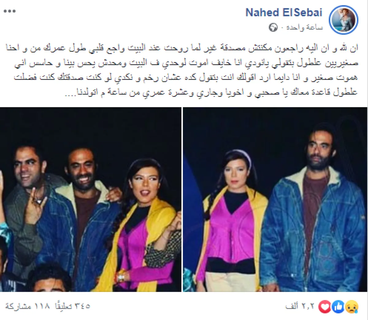 ناهد السباعي نشرت صورة لها برفقة الفقيد من كواليس تصوير مسلسل "السبع وصايا" وعلقت عليها قائلة: انا لله وانا اليه راجعون مكنتش مصدقة غير لما روحت عند البيت واجع قلبي طول عمرك من واحنا صغيرين.