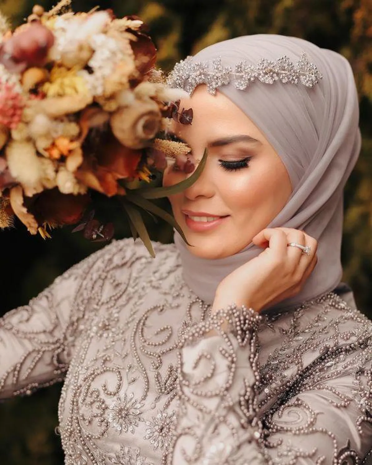 أما إذا قررتِ اعتماد ربطة الحجاب البسيطة للوراء، مع الفساتين عالية الرقبة، فلِمَ لا تفكرين باطلالة مختلفة مثل تاج الورود مع حجابِك، واعتمدي ألوان الورود المناسبة للموسم الذي ستقيمين فيه حفل زفافِك.