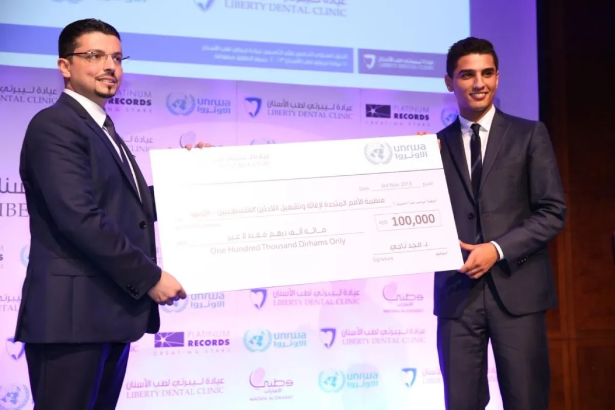 تسلم محمد عساف بصفته سفير الشباب لمنظمة الأونروا، شيكاً بمبلغ مئة ألف درهم إماراتي كتبرع من عيادة "ليبرتي" لطب الأسنان إلى منظمة الأمم المتحدة لإغاثة وتشغيل اللاجئين.