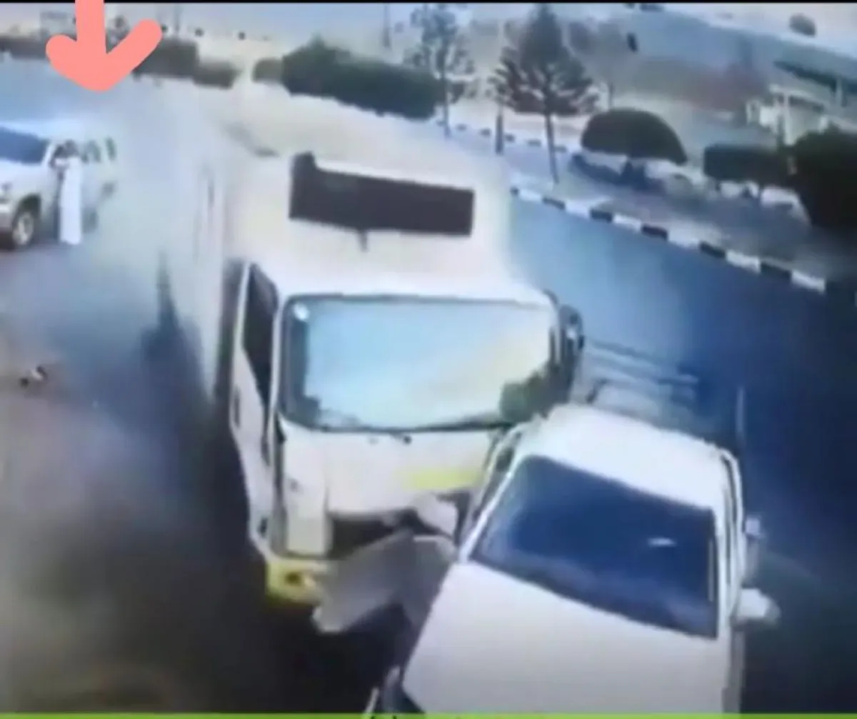 وأظهر مقطع فيديو، رصدته كاميرا مراقبة، شاباً يمشي في اتجاه سيارته التي أوقفها على الطريق العام قبل أن يتفاجأ بشاحنة مسرعة، تصدم سيارةً أخرى، كانت تسير على الطريق، لينزلق الشاب من أمام السيارة بانسيابية دون أن يتعرض للأذى.