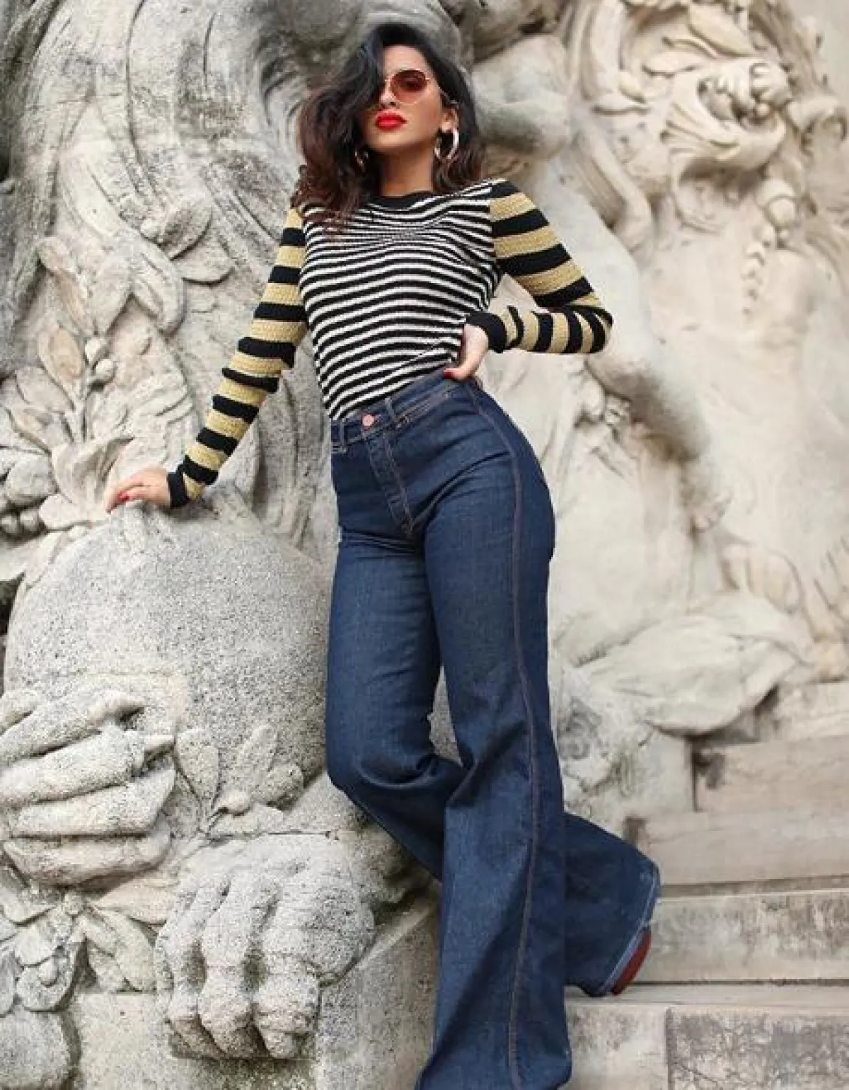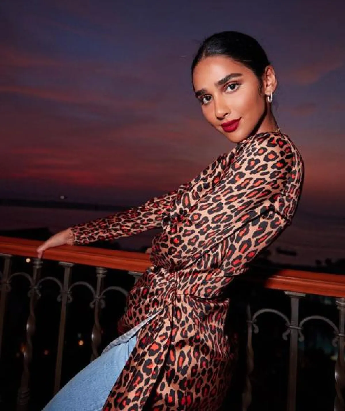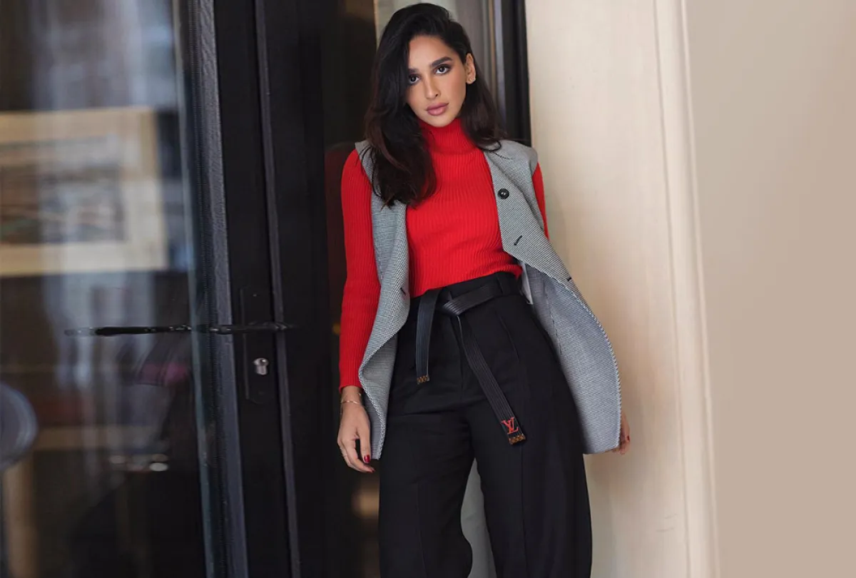 الأحمر يصنف من ضمن أكثر الألوان حرارة وجاذبية، وهو مثالي مع الشعر الأسود، ولهذا فقد شاهدنا هلا العبدلله كثيرًا في هذا اللون، وقد نسقته بأساليب مختلفة منها الرسمي ومنها الكاجوال، مثل هذا اللوك المميز الذي اعتمدت فيه توب بياقة عالية حمراء نسقت من فوقها جيليه باللون الرمادي، ومعهما اختارت بنطلونًا بخصر عالٍ أسود، زينت خصره بحزام من الجلد من لويس فويتون Louis Vuitton.