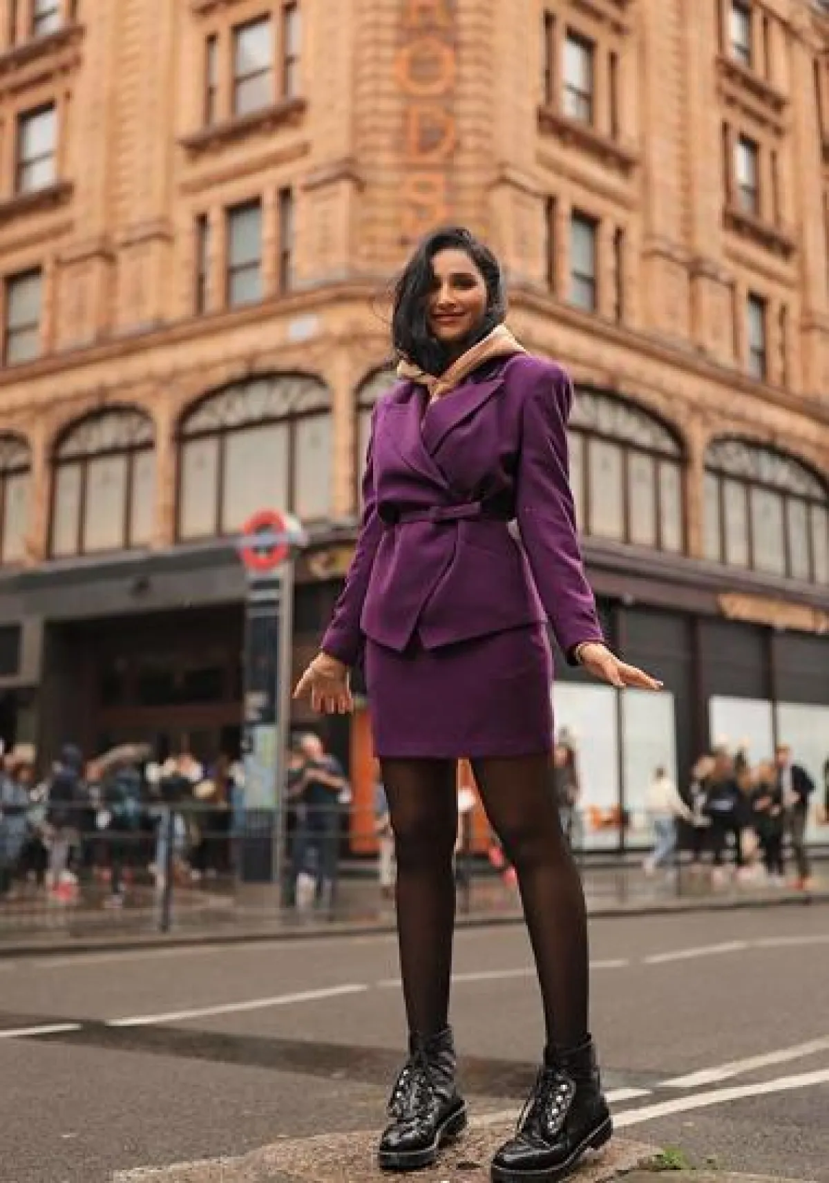 البنفسجي من أكثر الألوان الرائجة هذا الموسم، وضمن مجموعات خريف وشتاء 2019-2020، وقد شاهدنا هلا العبدلله وقد اعتمدت هذا اللوم في أكثر من مناسبة وأكثر من أسلوب، وأحدثها كان في تايور فنتج اختارته من كريستيان ديور Christian Dior مؤلف من جاكيت بليزر وتنورة قصيرة، وقد نسقت من تحته سويتشرت باللون البيج، واختارت معه حذاء كاحل من الجلد مزينًا بالأربطة.