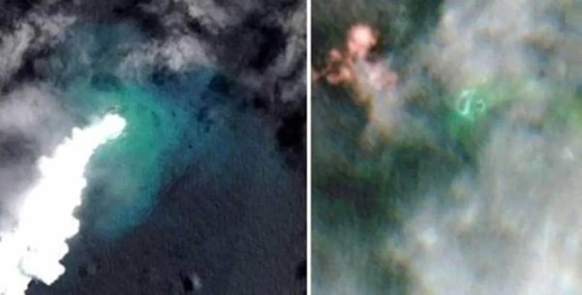وفي الصورة إلى اليمين، النقطة الخضراء الكبيرة هي الجزيرة الجديدة التي نشأت من جراء الثوران البركاني، وتقع بجوار الجزيرة التي اختفت الآن.