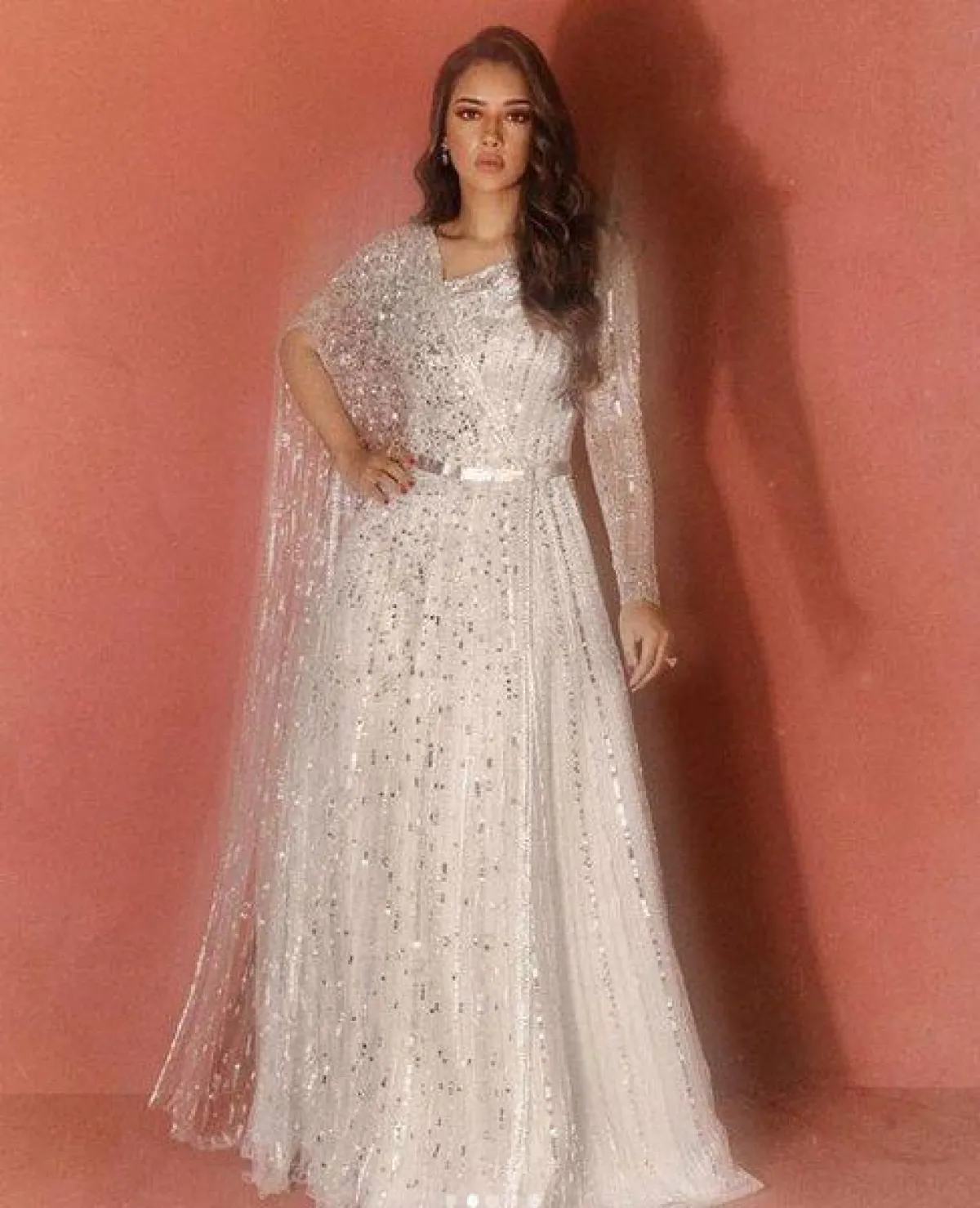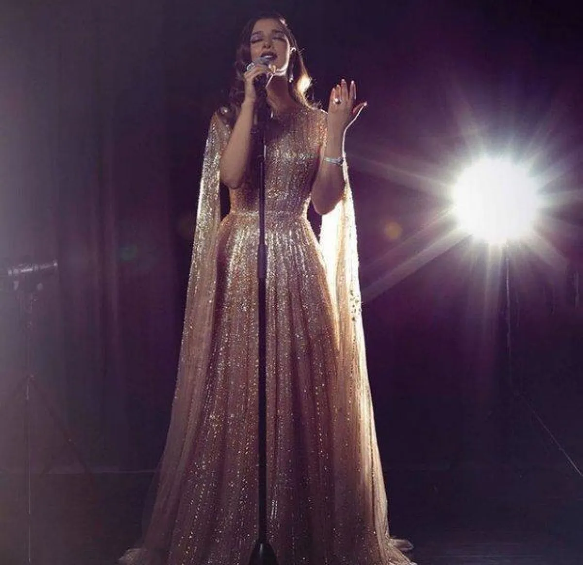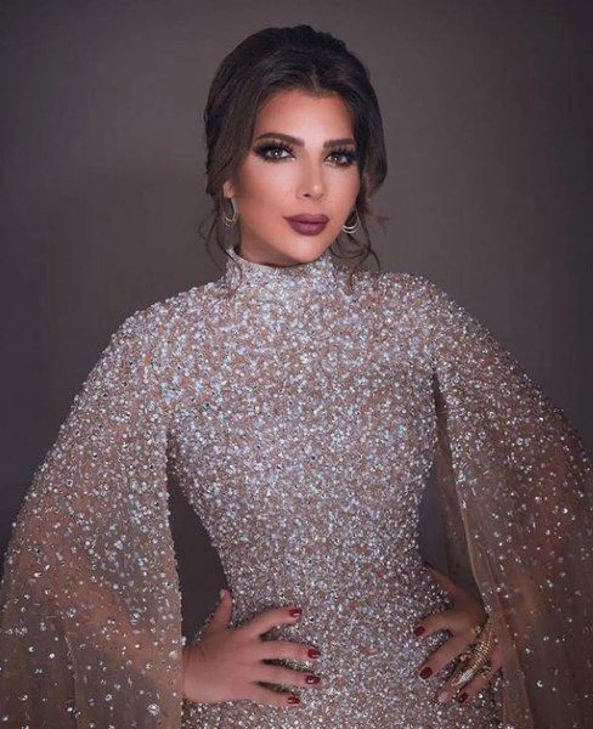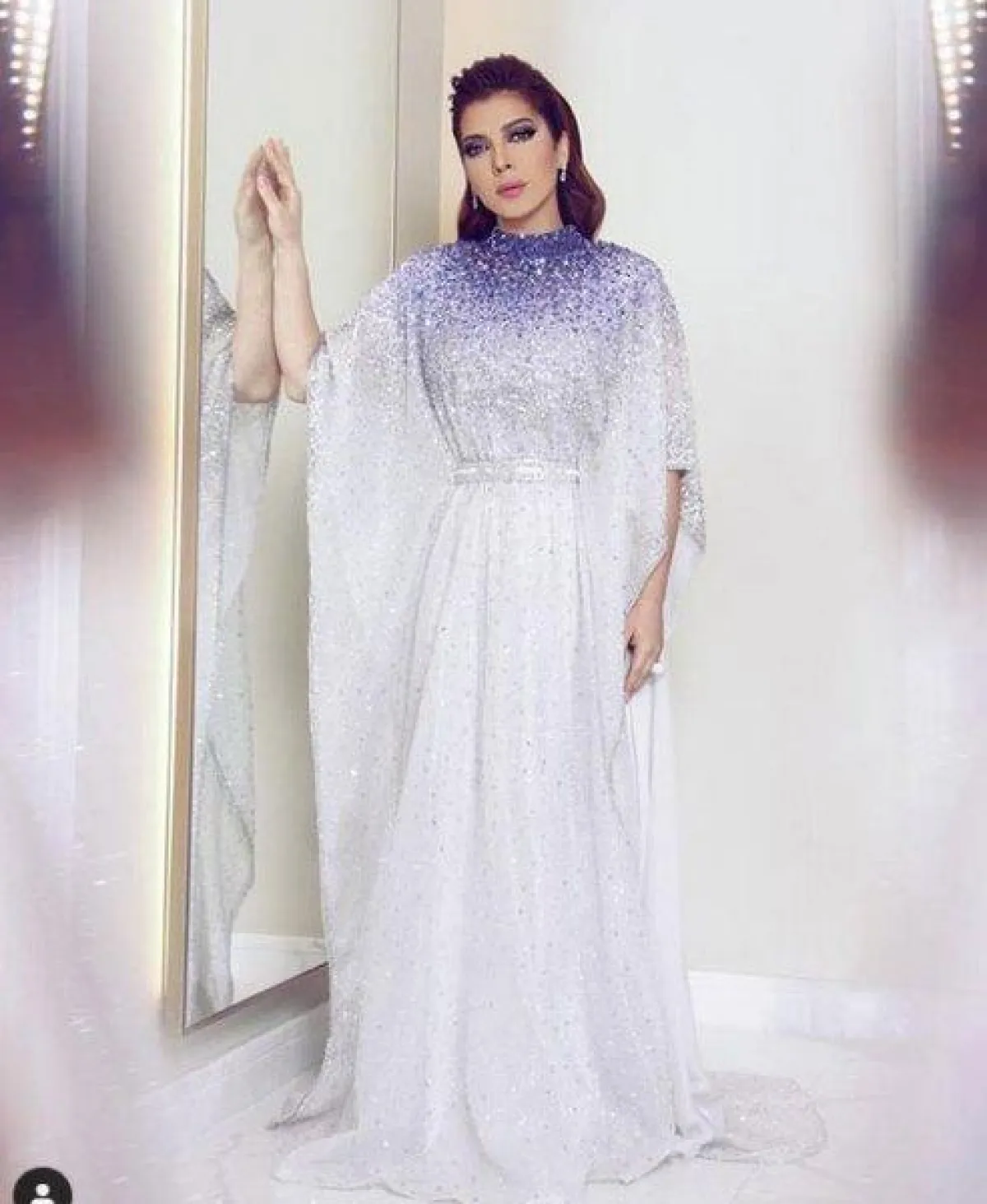 ولمزيد من الفخامة، تألقي بفستان بصيحة الكاب مرصع بالفصوص البرّاقة بالكامل على طريقة أصالة.