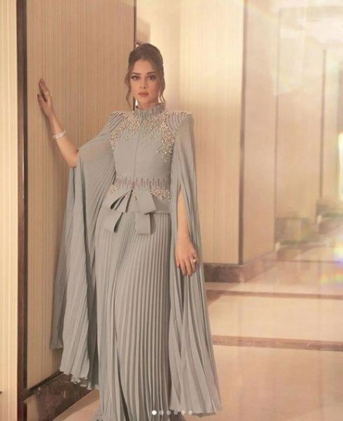 تميز الفستان بتصميمه المحتشم ليناسب العروس المحجبة، حيث أنها بأكمام طويلة جداً تمتد حتى الأرض وبقبّة مرتفعة.