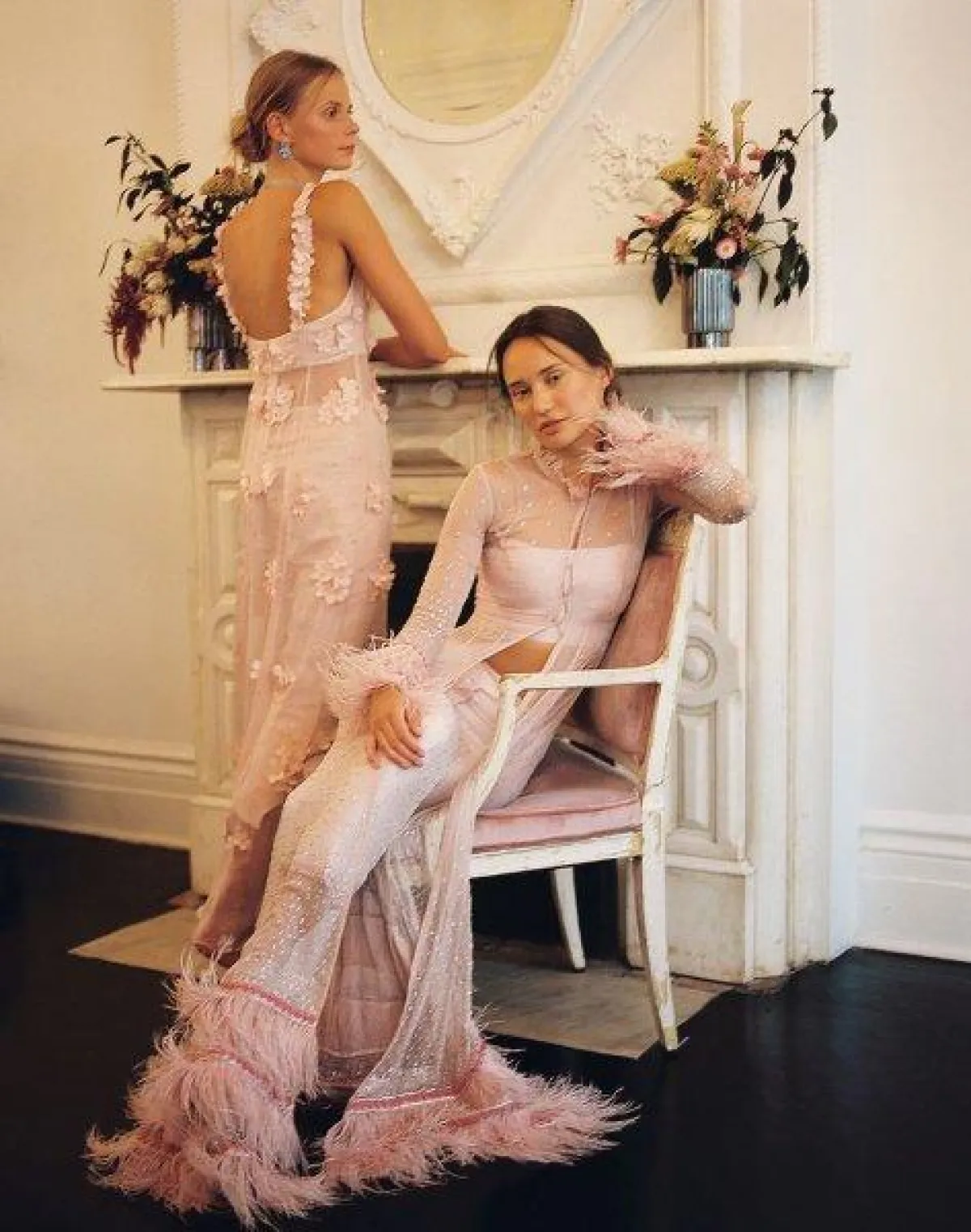 كما قدمت ماركة Sahroo فساتين زفاف ناعمة باللون الوردي ومزينة بلمسات الريش من أسفل وكذلك بالورود الوردي البارزة.