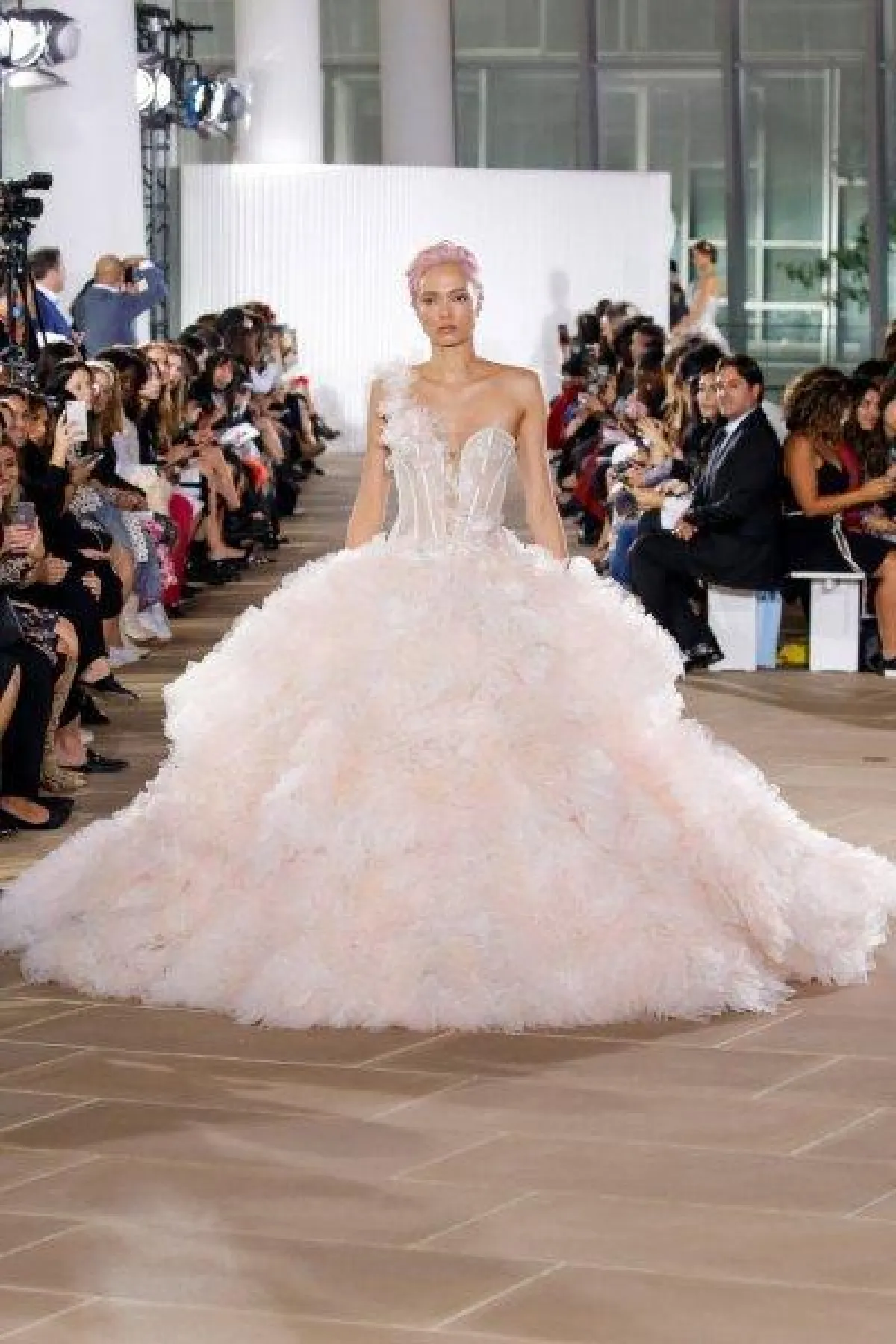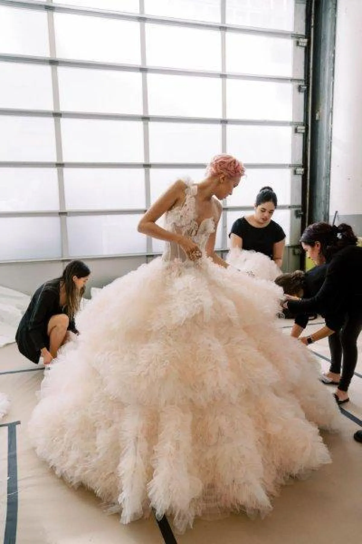 كما قدمت ماركة مونيك لولييه Monique Lhuillier فساتين زفاف وردي منفوشة بصيحة الـRuffles مع طرحة تول وردي طويلة مزينة بالورود البارزة لمزيد من السحر.