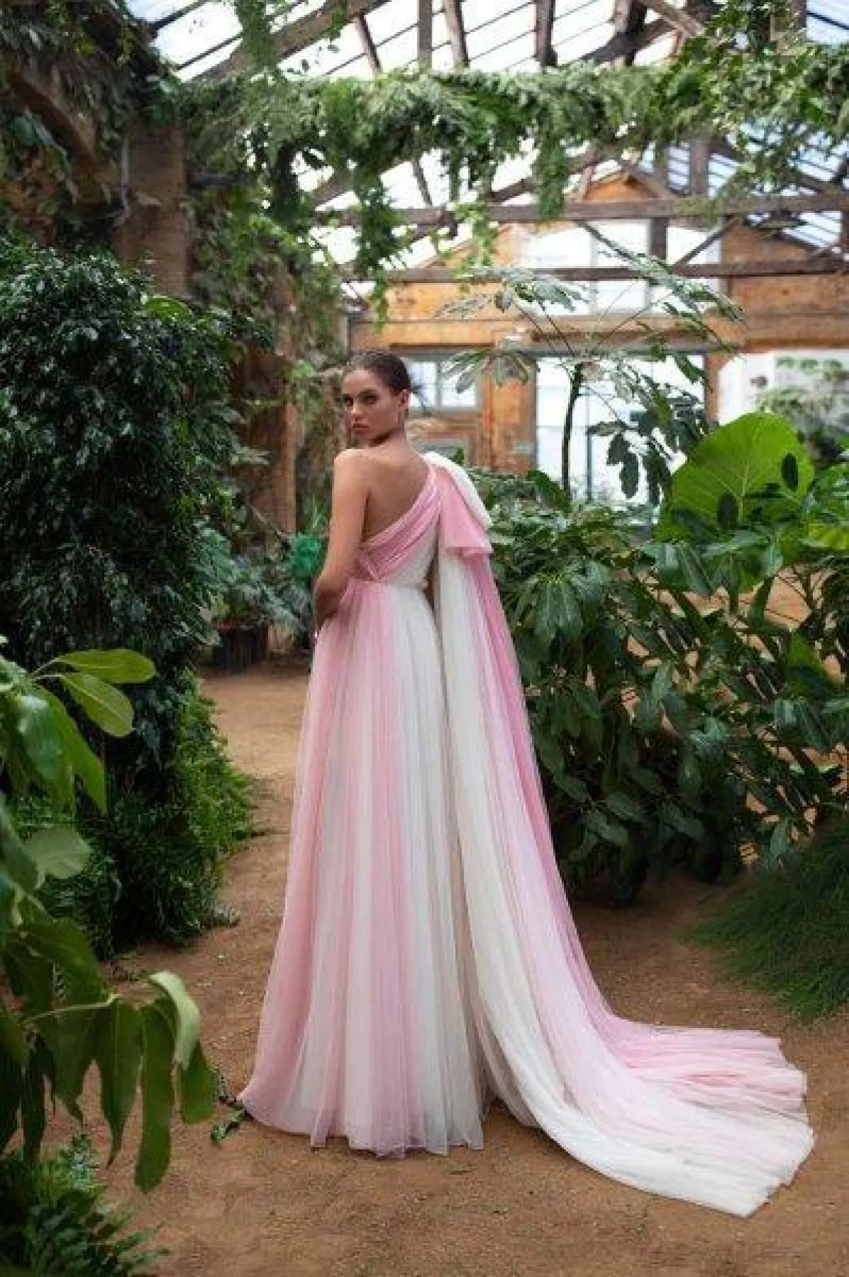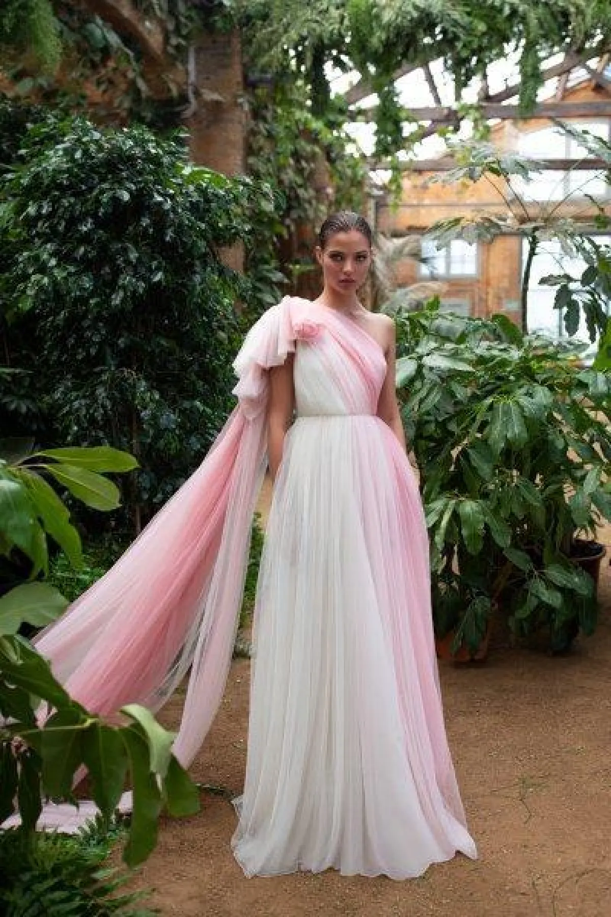 الفستان بكتف واحد وبوشاح طويل ينسدل ليلامس الأرض.