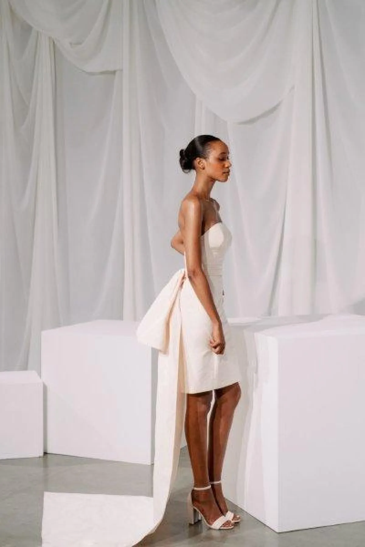 قدمت ماركة Amsale فستان وردي قصير بقصّة عمودية مع وشاح طويل من الخلف ومزين بوردة كبيرة.