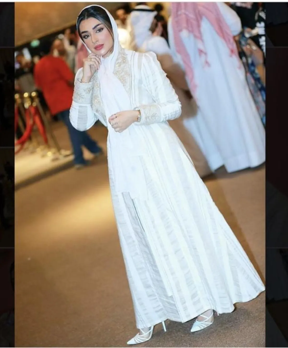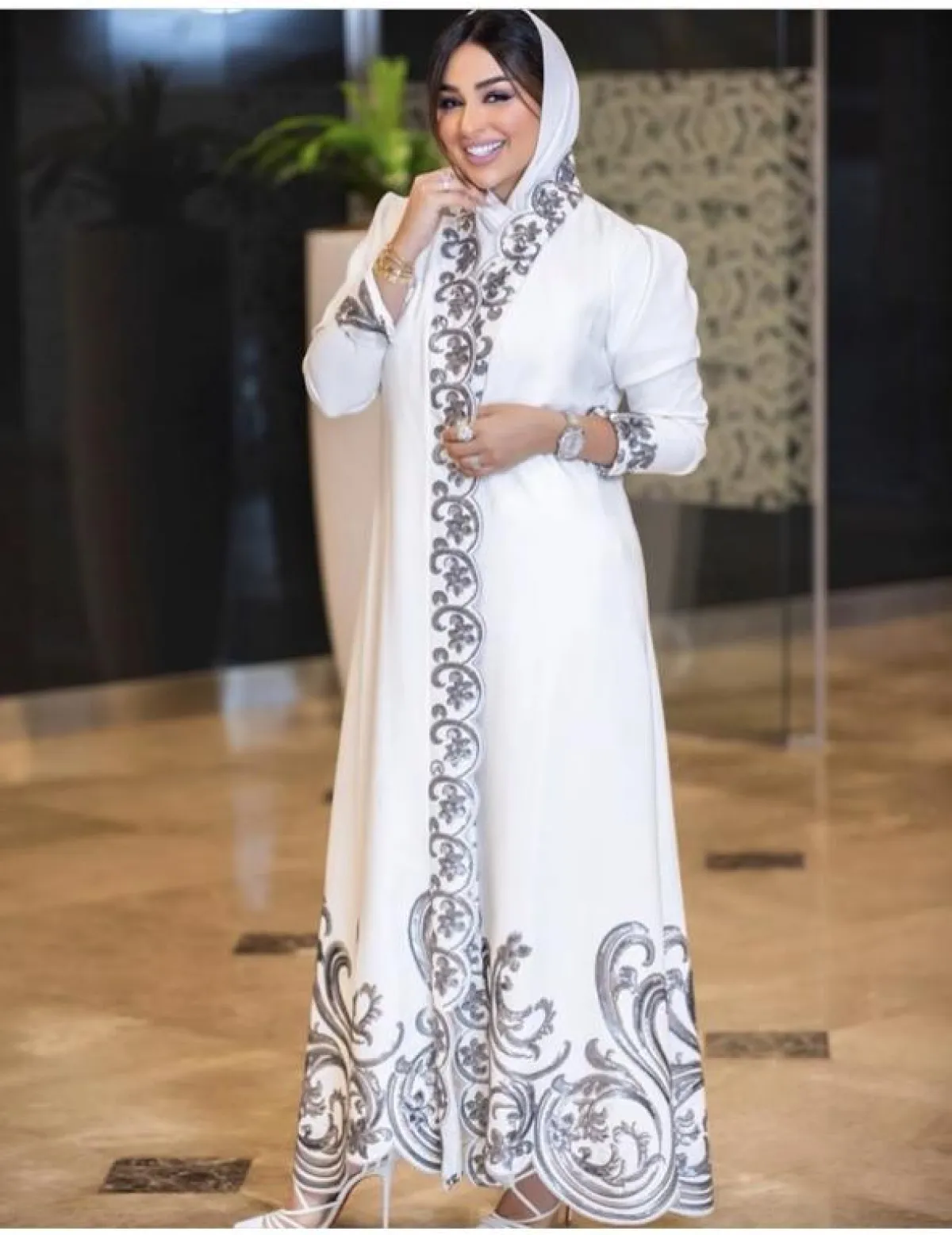 أعجبنا كذلك هذا الموديل للعبايه باللون الأبيض مع الزركشة باللون الفضي من وحي آمال الأنصاري، مناسبة أكثر لأجواء الحفلات، نسقت معها كعبًا عاليًا أبيض، وطرحتها البيضاء لاطلالة محايدة.
