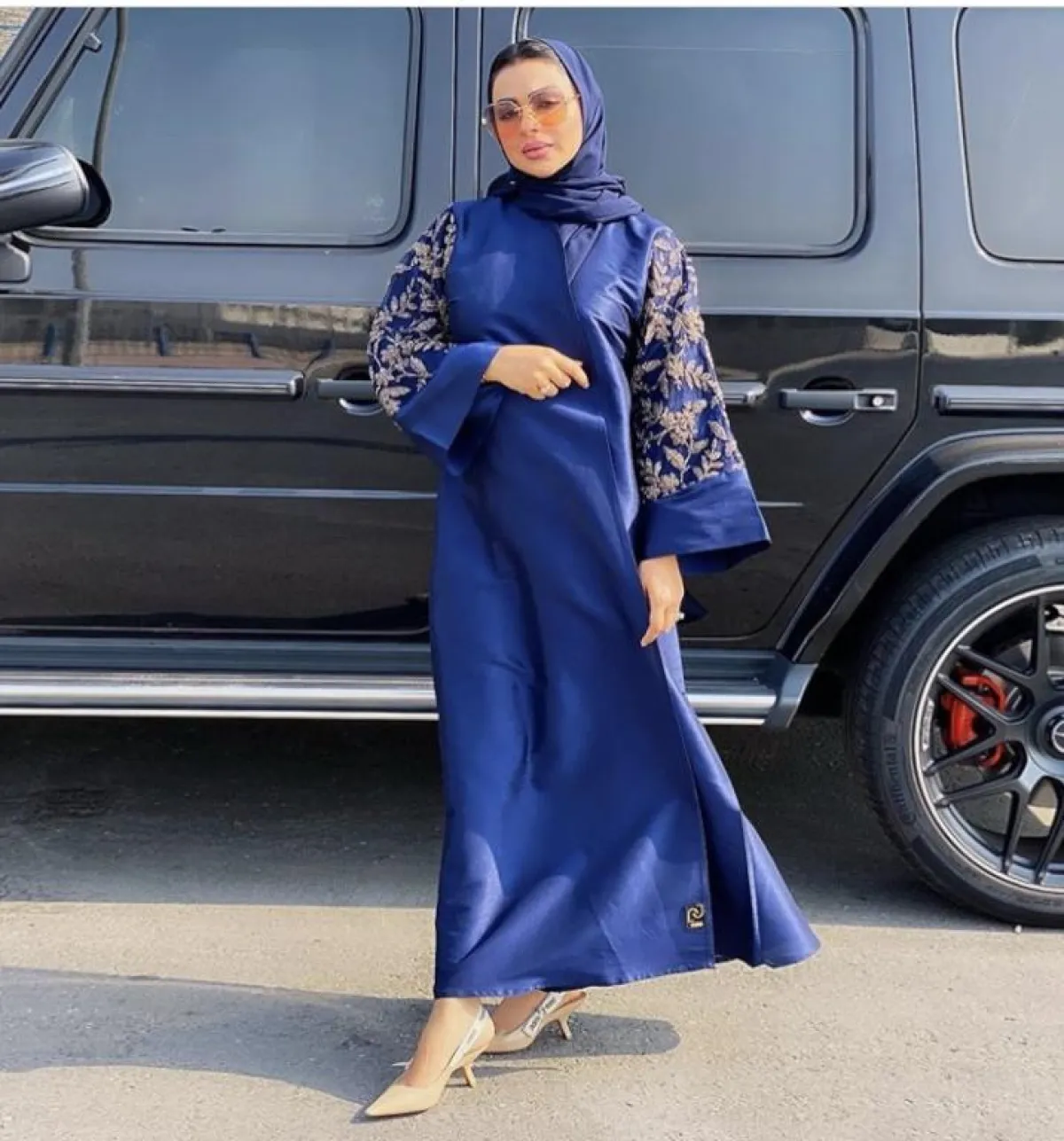 اختاري عبايه باللون الأزرق الزهري فخمة بقماشتها اللامعة، وكذلك بالرسومات المزخرفة على الأكمام، نسقت معها صندلًا أنيقًا من شانيل باللون النود ليمنحها مظهرًا بسيطًا مع اللوك الفخم.