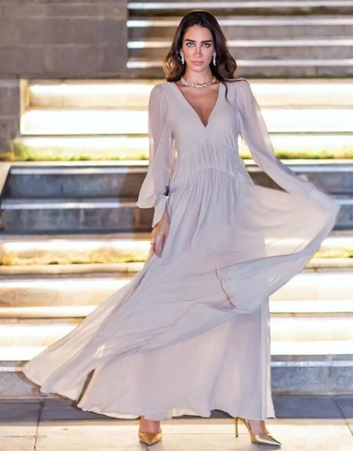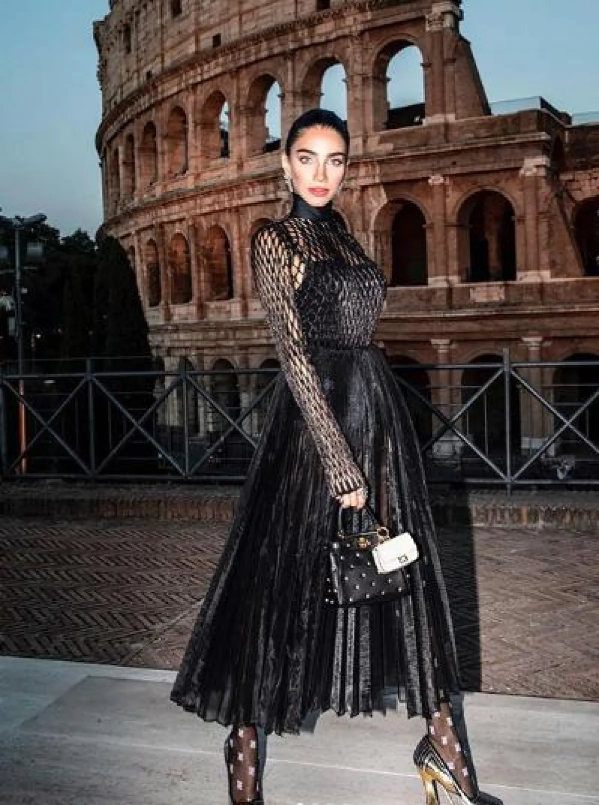 عندما يتعلق الأمر بالاطلالات الرسمية، فليس هنالك أجمل من اللون الأسود وقد اعتمدته جيسيكا قهواتي على اطلالة أنثوية راقية، اختارت فيها فستانًا من فندي Fendi بقصة مميزة مغطى بالشبك من الأعلى، مع تنورة بليسيه وصل طولها حد الكاحل، واختارت مع الفستان حذاءً بكعب عالٍ وشنطة يد مميزة، ومجوهرات ماسية ناعمة، وهذا اللوك مثالي لطويلات القامة من ناحية طول الفستان وقصته.