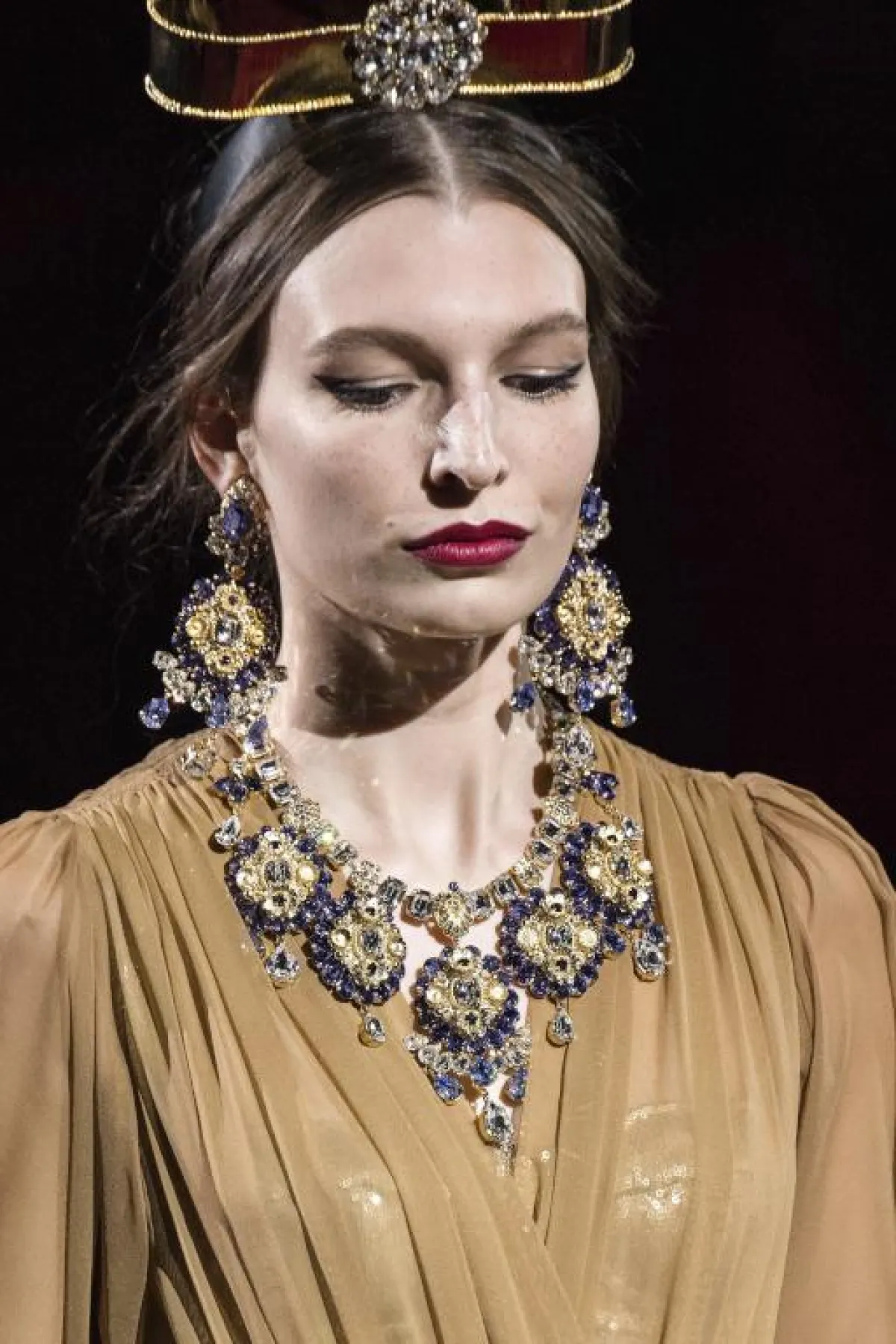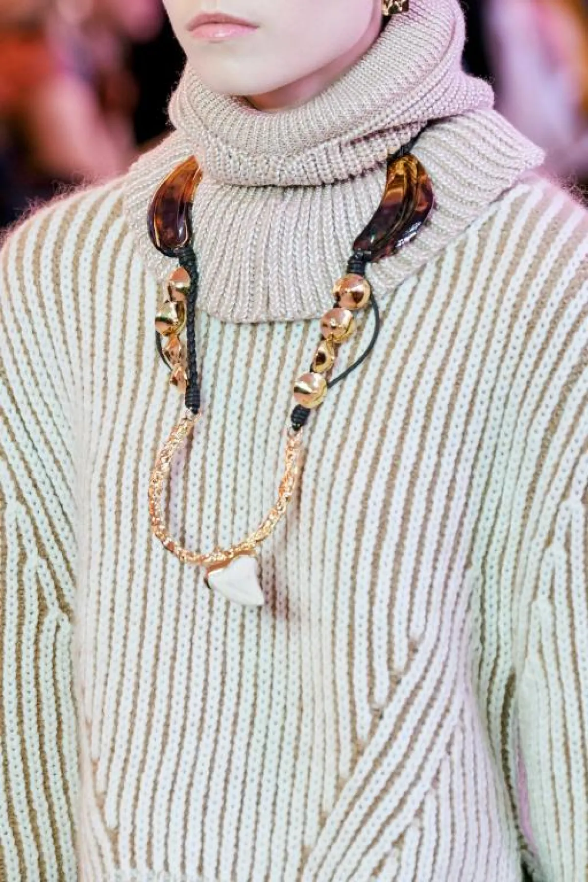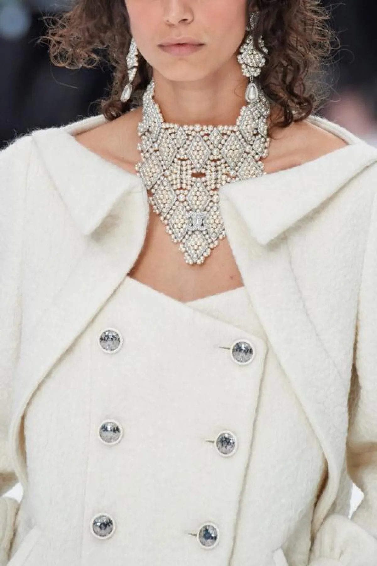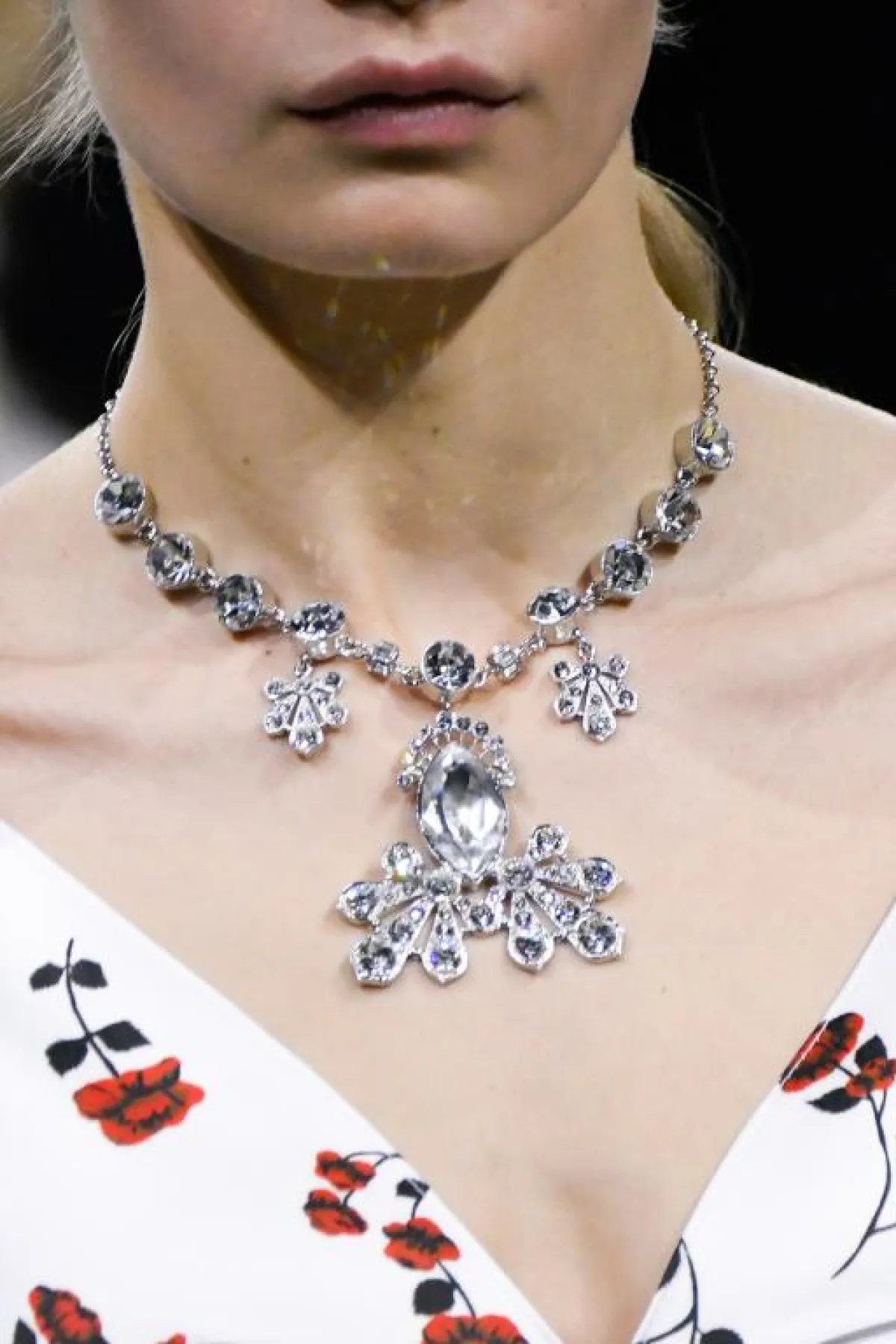 تواصل القلادات كبيرة الحجم المرصعة بالكريستالات واللؤلؤ الأبيض حضورها على منصات عروض الأزياء الجاهزة وبرعت أسماء بارزة مثل دولتشي آند غابانا Dolce & Gabbana وشانيل Chanel في تقديم تصاميم فخمة ستثري اطلالتك في السهرات الهامة وننصحك بتنسيقها مع فساتين أحادية اللون خالية من التطريز.