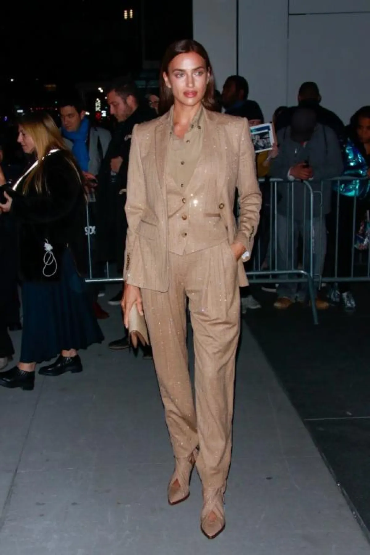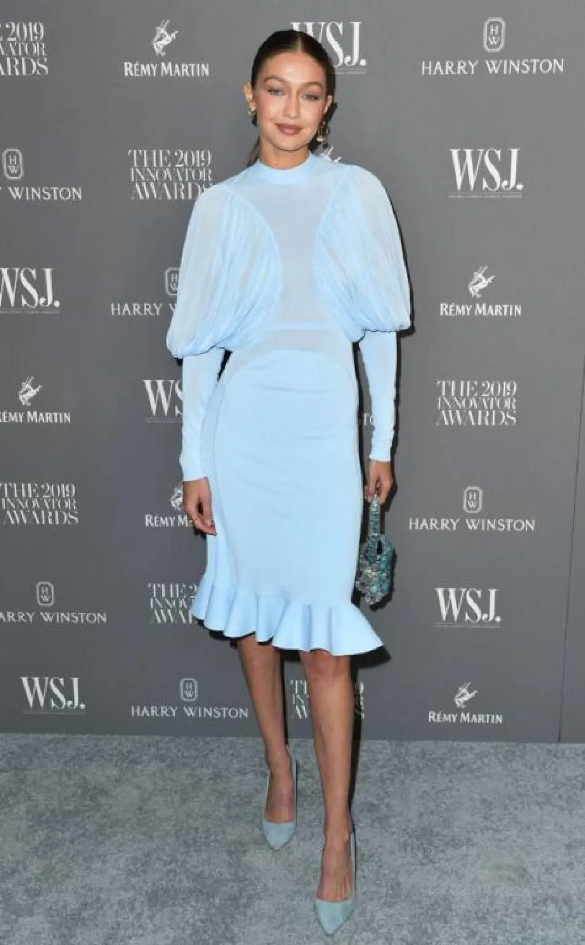 أيضًا اختارت جيجي حديد Gigi Hadid اطلالتها هذا الأسبوع من بربري Burberry، لكن على عكس اطلالة كيم فقد بدت أنثوية وناعمة، وكانت عبارة عن فستان ميدي باللون الأزرق الفاتح، تصميمه مميز ولا سيما عند الأكمام، وتنورته مزينة بالكشكش من الأسفل، وقد نسقت معه حذاءً بكعب عالٍ من اللون نفسه، وأكملت اللوك بشنطة يد براقة باللون الأخضر.