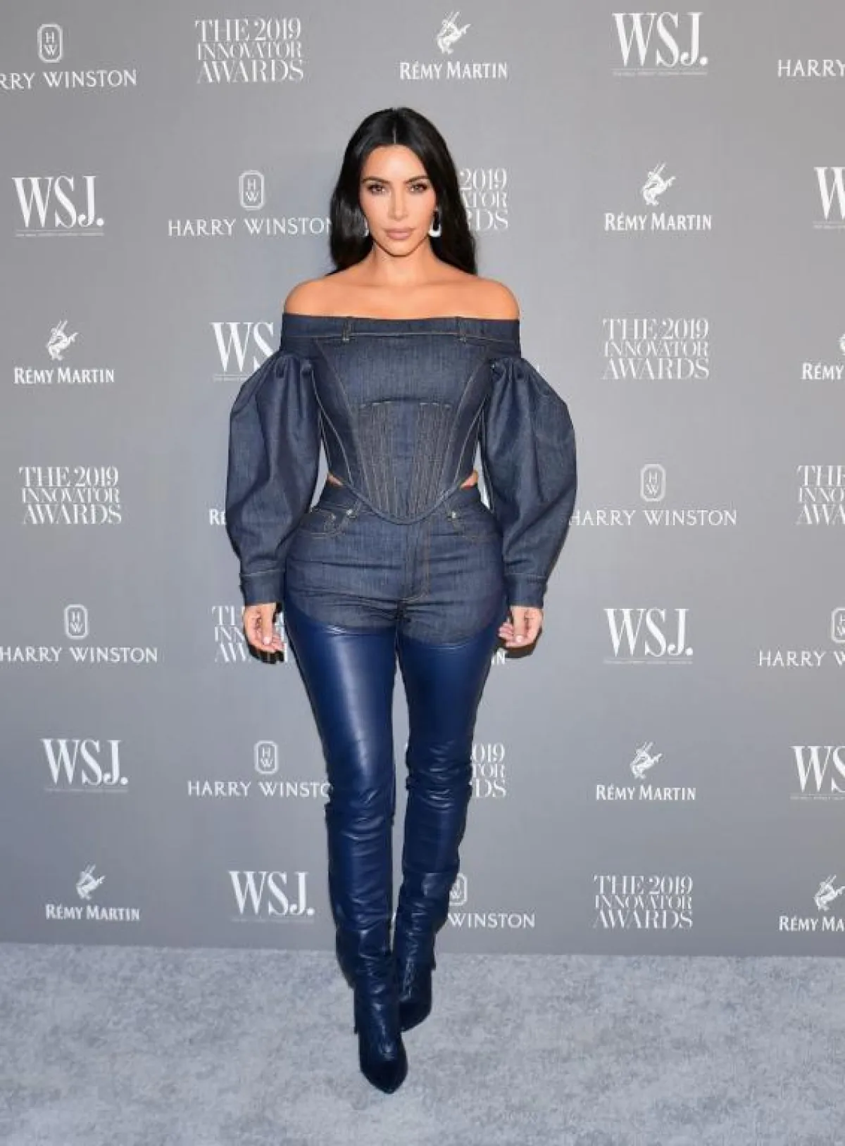 شاهدنا كيم كارداشيان وقد نسقت اطلالة لافتة من الجينز قامت دار بربري Burberry ومديرها الإبداعي ريكارود تيشي Riccardo Tisci بتصميمها خصيصًا لها، وكان عبارة عن توب بقصة كورسيه مستوحاة من العصري الفيكتوري بأكتاف مكشوفة، وأكمام منفوخة، مع بنطلون سكيني مصنوع من الجينز والجلد معه حذاء متصل به، وقد بدا اللوك عصريًّا ومبتكرًا.