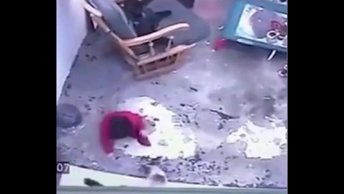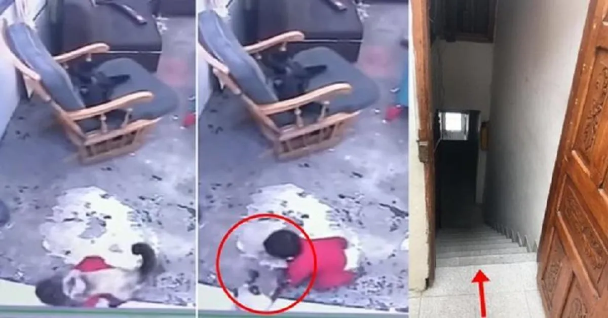 ويظهر في مقطع الفيديو، الطفل وهو يزحف تجاه باب الشقة الذي كان مفتوحا ومطلا على سلم طويل .