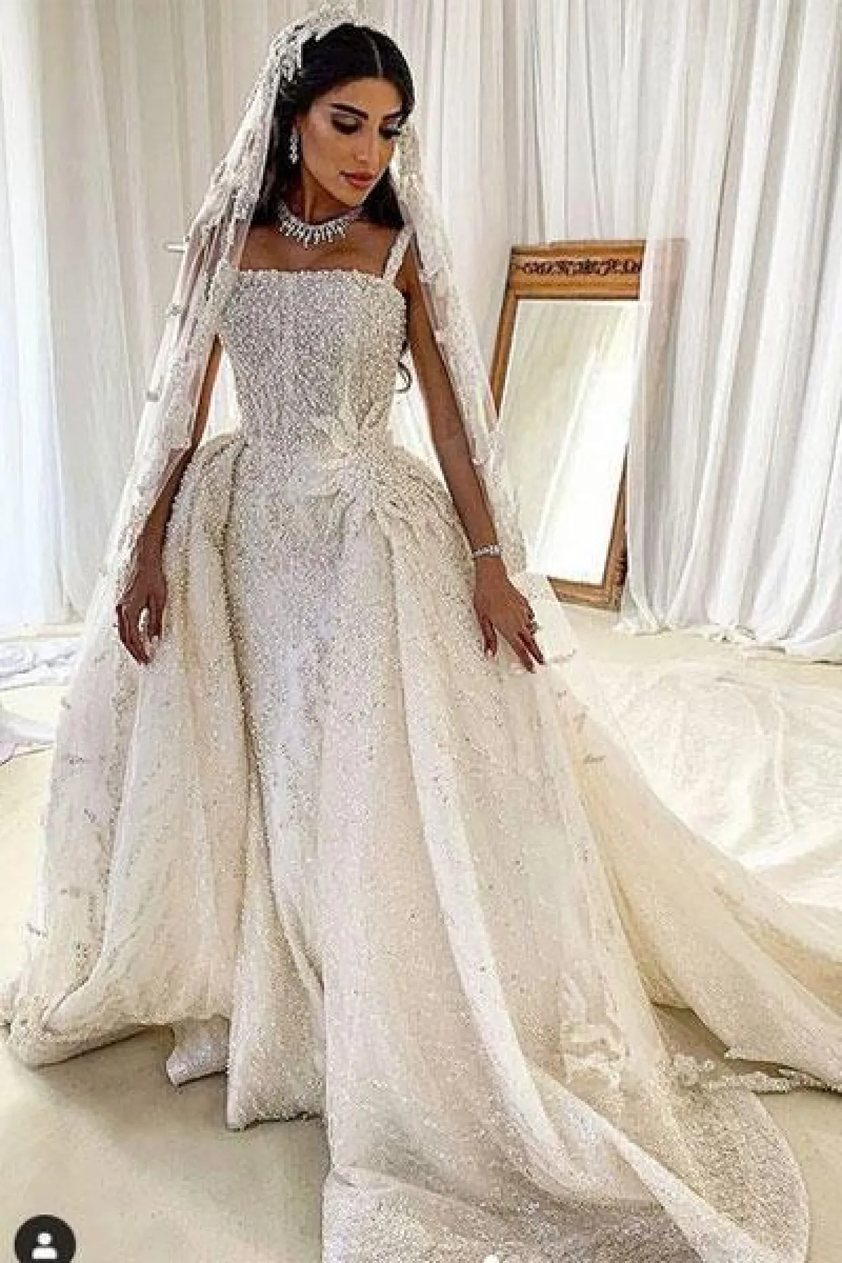 تعد الفساتين بالتنورة الإضافية من أبرز صيحات أثواب الأعراس في السنوات الأخيرة، والتي تمكن العروس من الظهور بإطلالتين في يوم الزفاف، حيث يمكن التخلي عن التنورة الإضافية بسهولة.