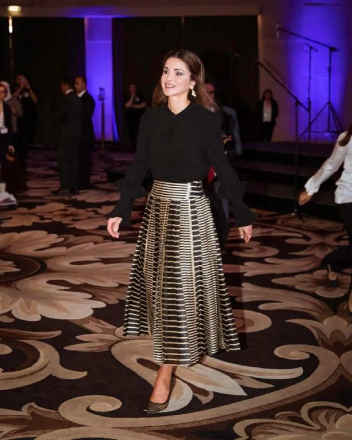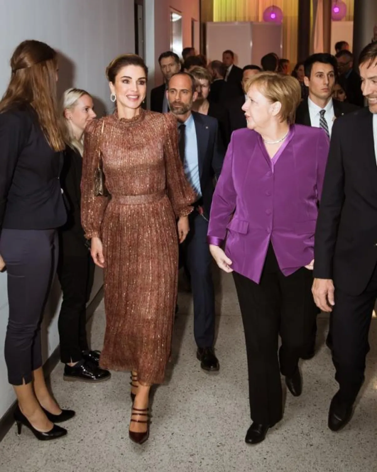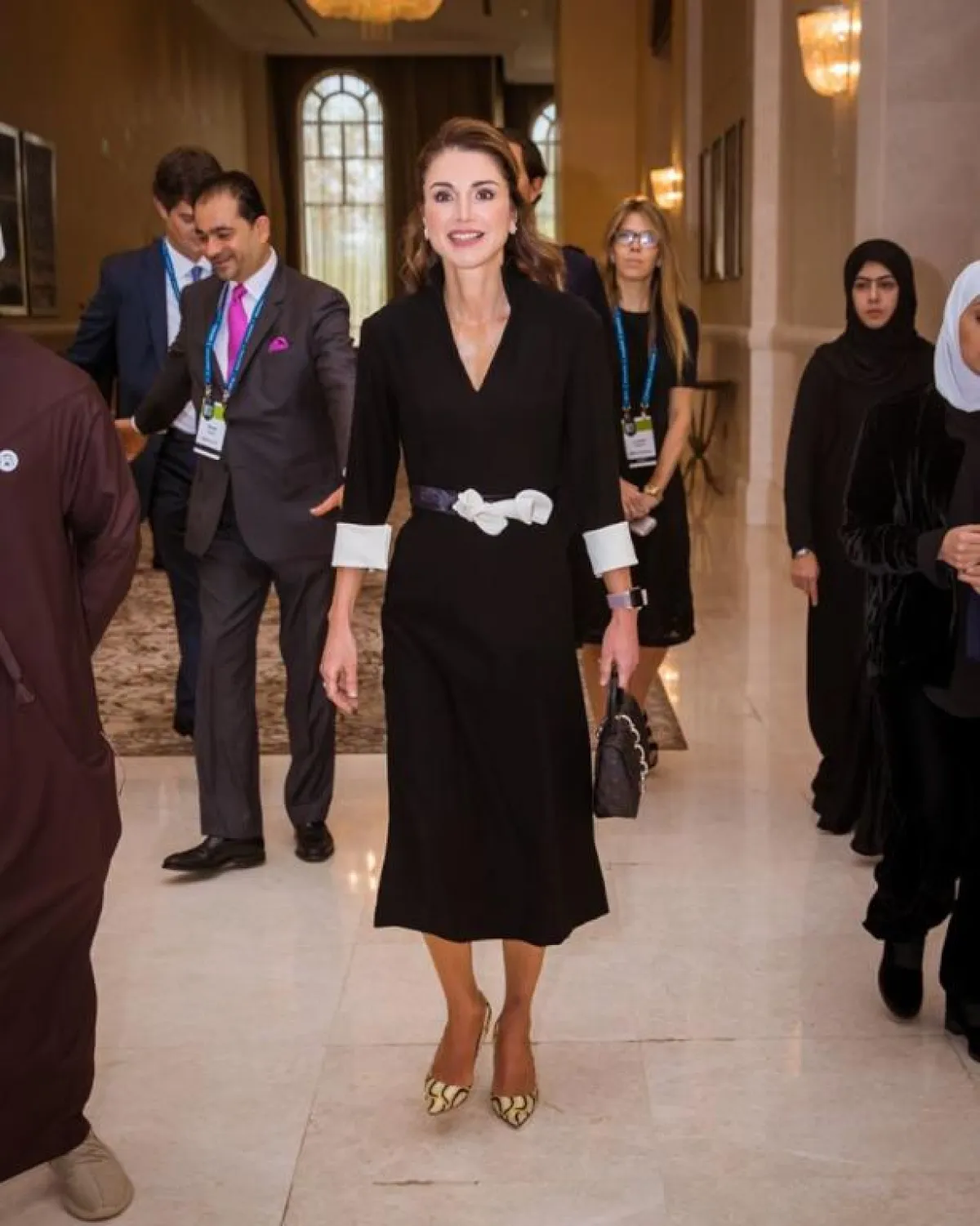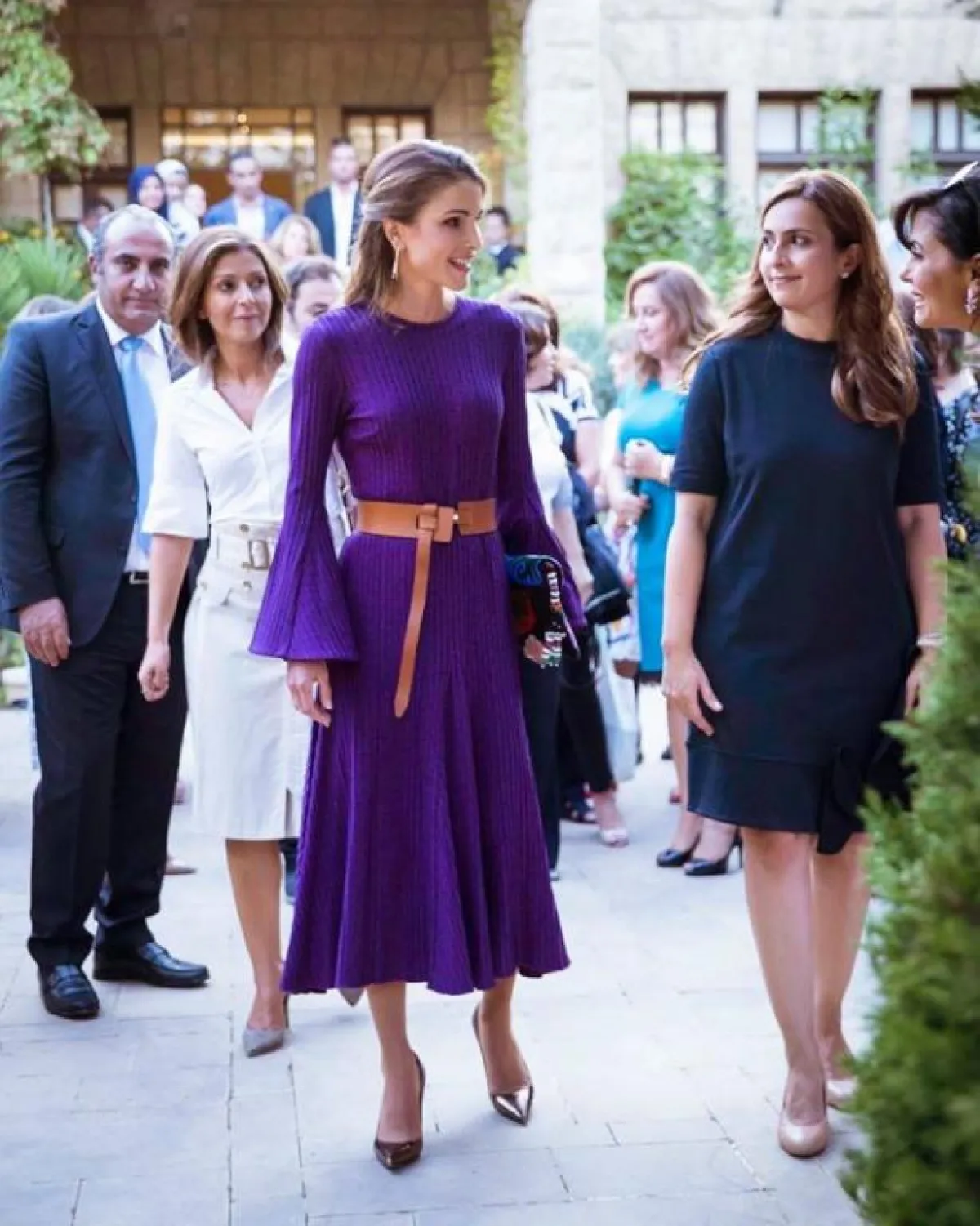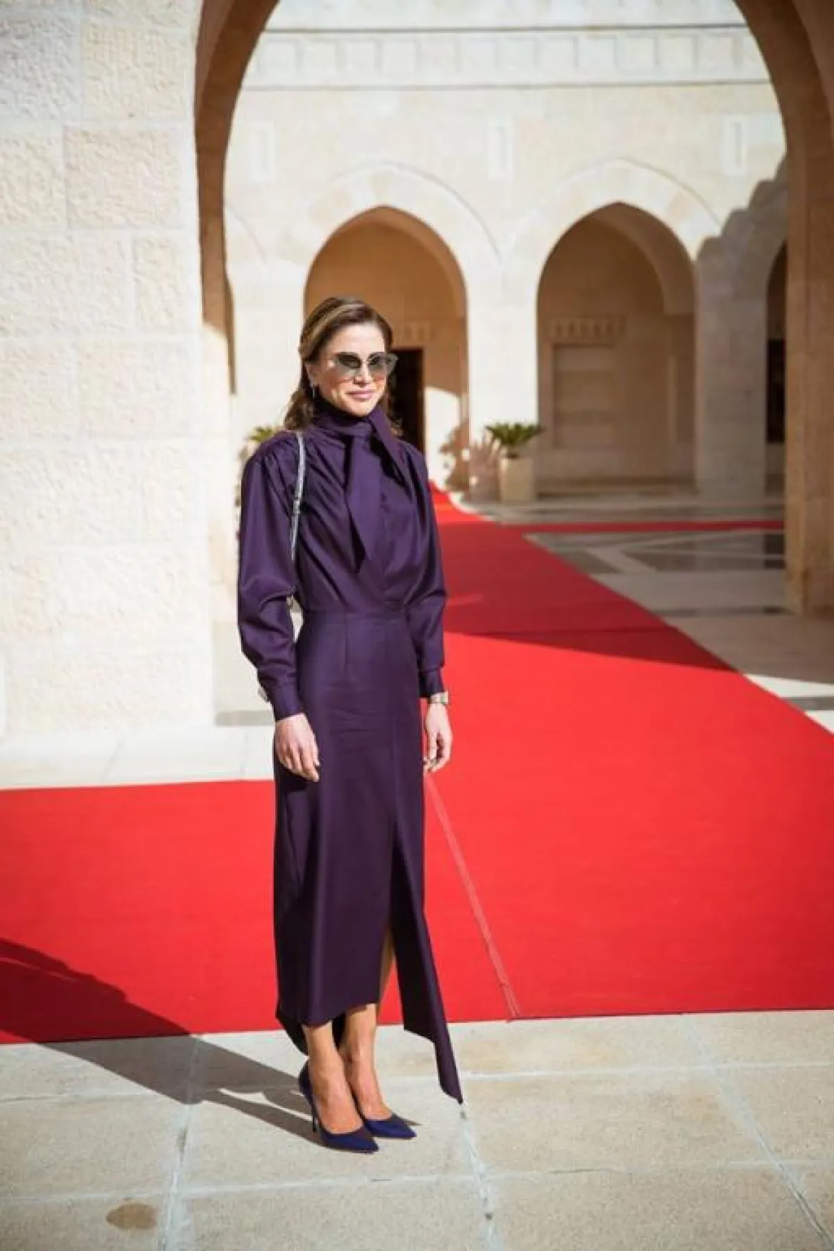 أحد أكثر الألوان رواجًا ضمن مجموعات موسم خريف وشتاء 2019-2020، هو البنفسجي، والملكة رانيا من عاشقات هذا اللون، وقد شاهدناها به في أكثر من مناسبة مثل هذه الاطلالة التي اختارت فيها فستان ميدي بنفسجيًّا بقصة مستوحاة من السبعينيات، زينت خصره بحزام من الجلد باللون العسلي، وأكملت اللوك بحذاء بكعب عالٍ وحقيبة مميزة.