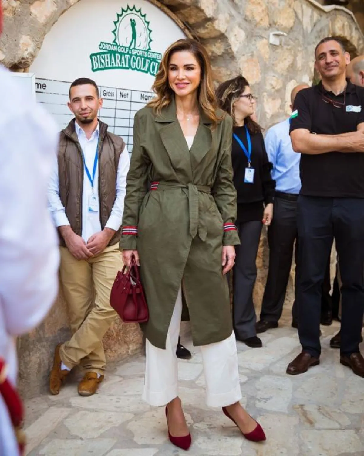 الترانشكوت عاد للموضة بقوة في المواسم الماضية، وهو قطعة مثالية لاطلالات الخريف، حيث إنه يحمي من البرد أو المطر، من دون أن يكون قماشه سميكًا وثقيلًا، وقد نسقت الملكة رانيا اطلالة أنيقة وشبابية في الترانشكوت الطويل الذي اختارته باللون الأخضر الزيتي، مع تفاصيل ناعمة باللونين الأحمر والأبيض، وقد نسقت معه بنطلونًا أبيض وأكملت اللوك بحذاء بكعب عالٍ وشنطة يد باللون الأحمر العنابي.