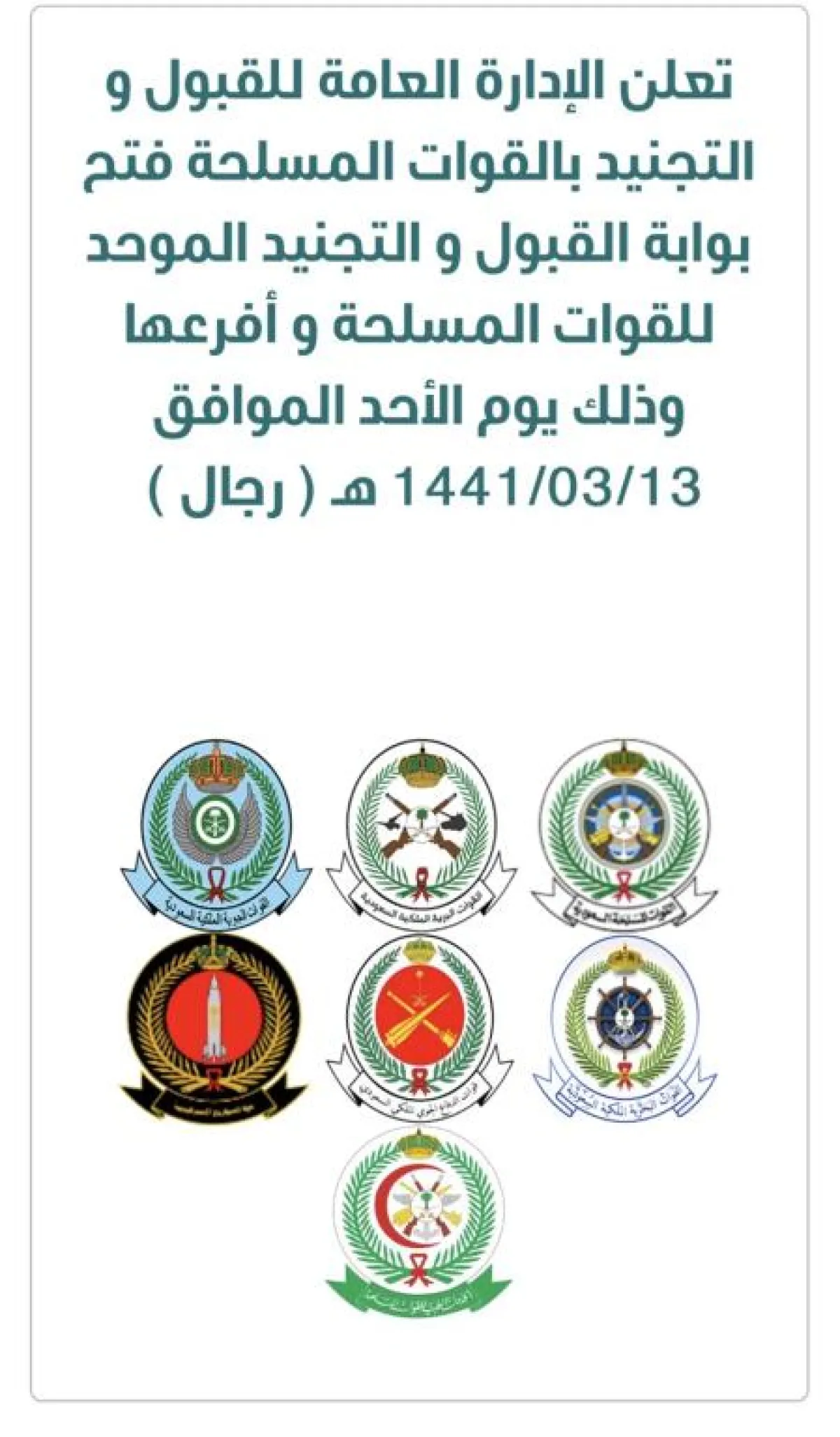 القوات المسلحة تعلن فتح باب القبول لوظائف وزارة الدفاع، وكانت وزارة الدفاع قدأعلنت عن فتح بوابة القبول والتجنيد الموحد للقوات المسلحة؛ للتقديم على الوظائف من رتبة "جندي" إلى رتبة "رقيب"، في جميع أفرع القوات المسلحة؛ وذلك اعتبارًا من الأحد 13/ 3/ ١٤٤١هـ.