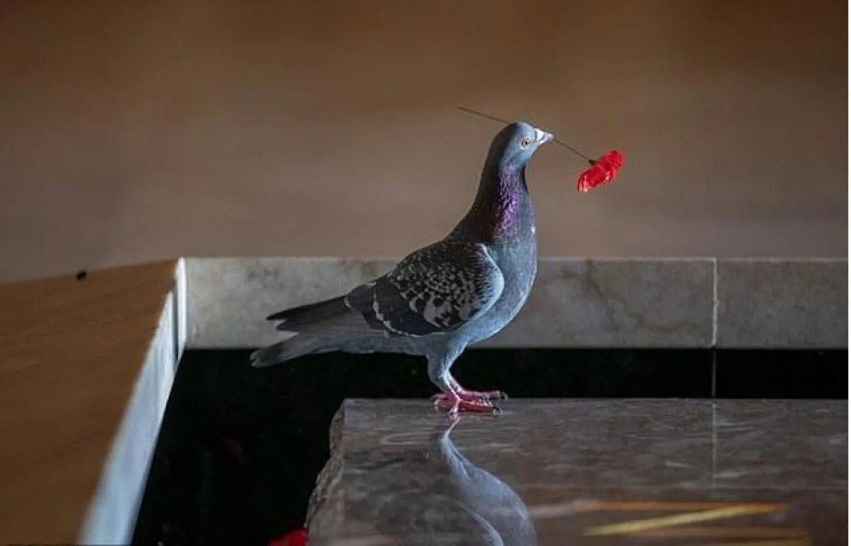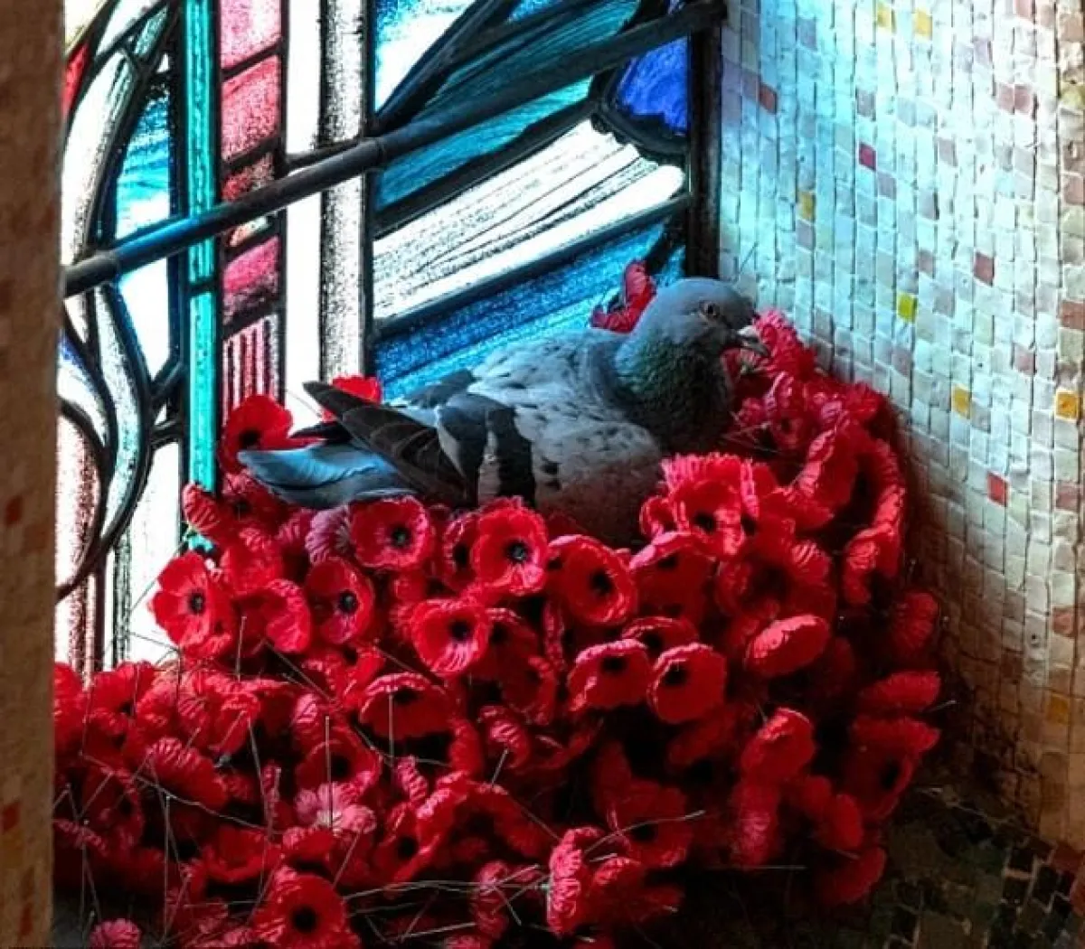 وذكرت صحيفة (وست أستراليان)، ونقلاً عن «رويترز»، أن الحمامة شيدت العش بالزهور الحمراء تحت ضوء ناعم يتسلل من نافذة زجاج ملون في النصب التذكاري.