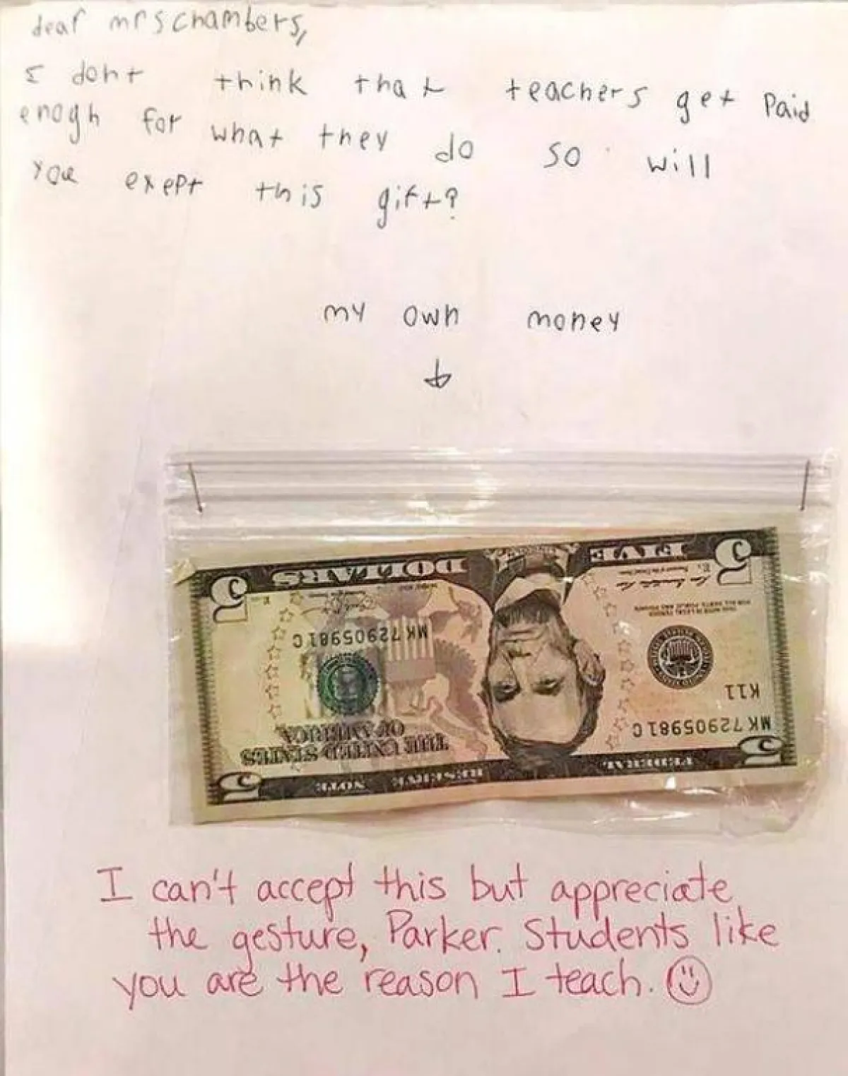 وكتب في الرسالة المؤثّرة: «لا أعتقد أن المعلّمين يحصلون على رواتب كافية مقابل ما يقومون به، فهل تقبلين مني هذه الهدية»؟