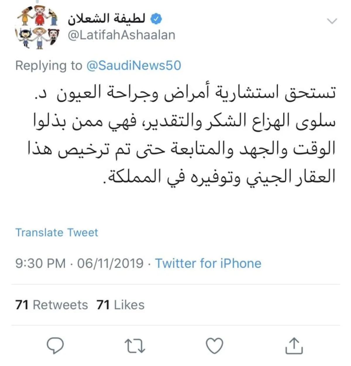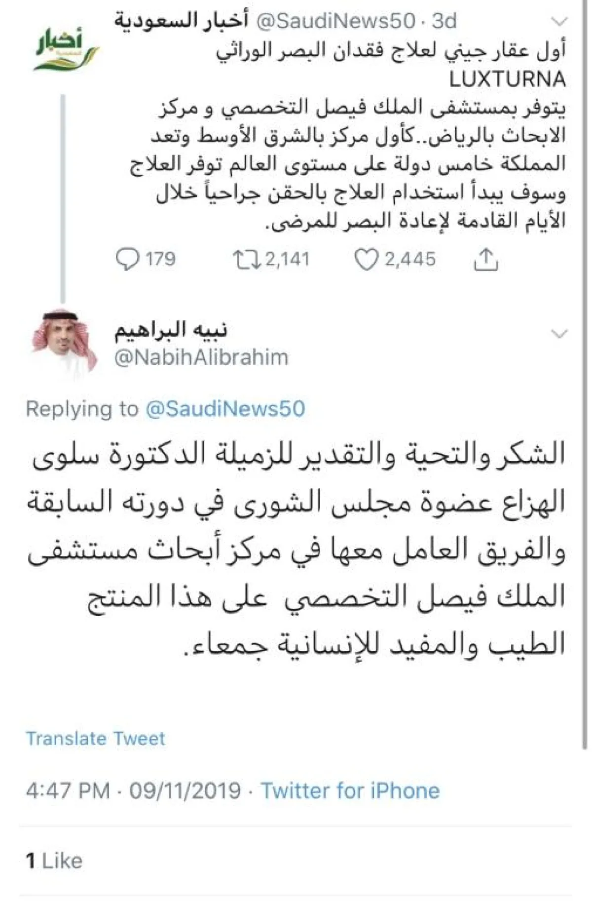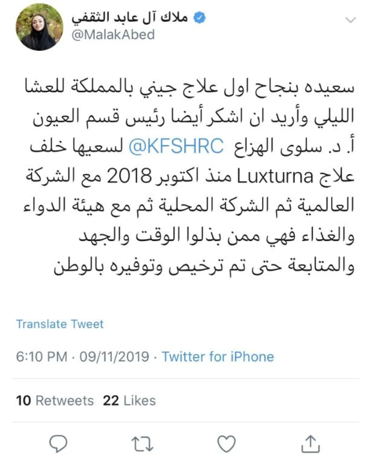 أما الدكتورة والباحثة ملاك آل عابد الثقفي، مدير المختبر الخاص بـ«برنامج الجينوم البشري السعودي»، في مدينة الملك فهد الطبية، فعبَّرت عن سعادتها بالإنجاز، قائلةً: «سعيدة بنجاح أول علاج جيني في السعودية للعشى الليلي، وأريد أن أشكر رئيس قسم العيون الدكتورة سلوى الهزاع على سعيها خلف علاج Luxturna منذ أكتوبر 2018 مع الشركة العالمية، ثم الشركة المحلية، ثم مع هيئة الدواء والغذاء، فهي ممن بذلوا الوقت والجهد والمتابعة، حتى تم ترخيص هذا الدواء وتوفيره في الوطن».