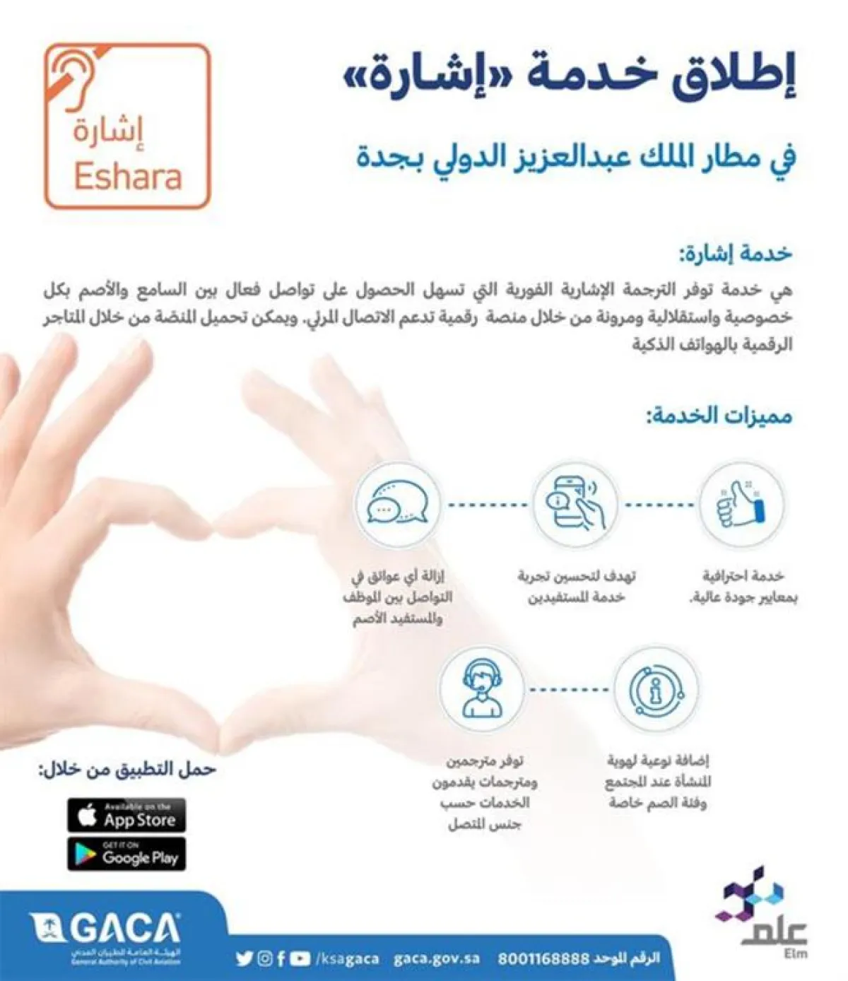 أطلقت الهيئة العامة للطيران المدني، اليوم الأحد، خدمة تطبيق «إشارة» للمسافرين الصُّم في مطار الملك عبدالعزيز الدولي بجدة، وذلك بالتعاون مع شركة «عِلم».