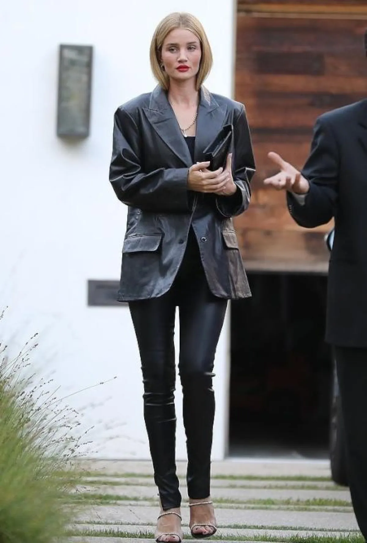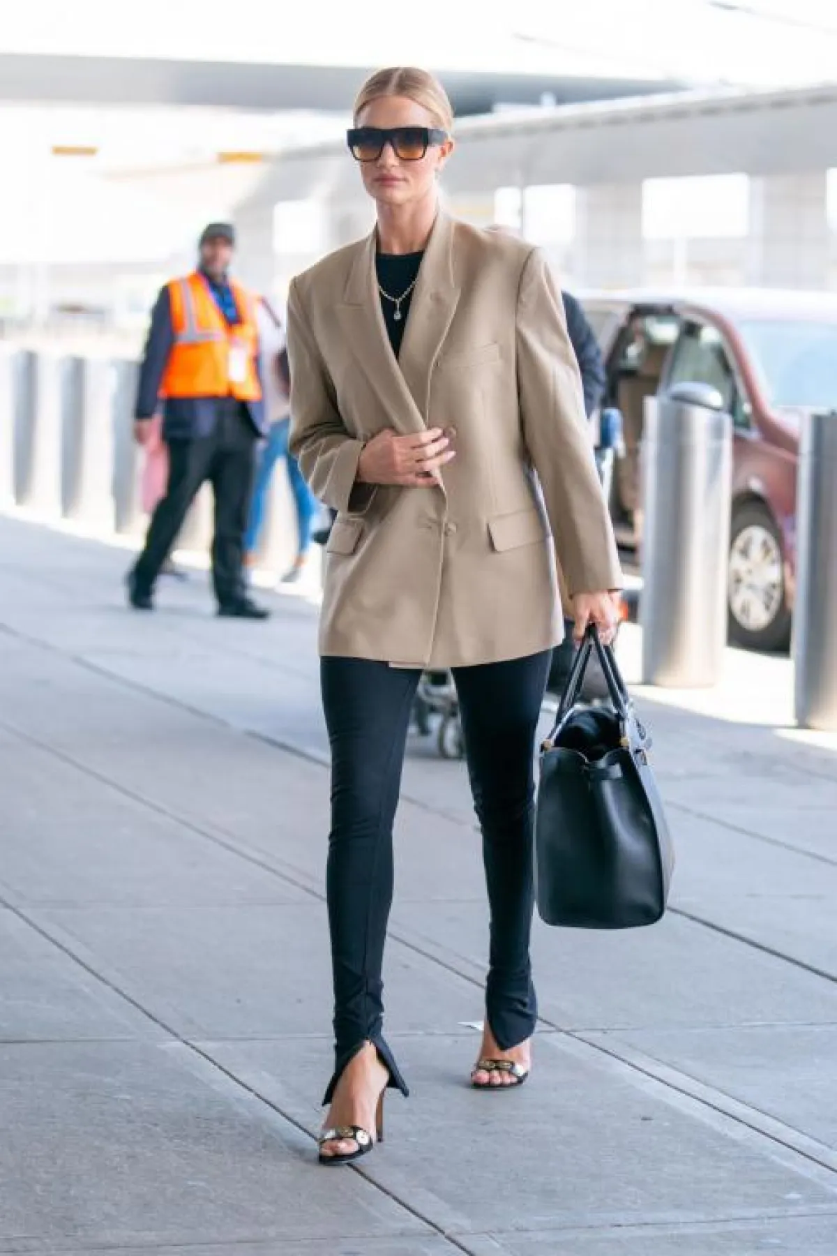 إطلالة رائعة نسقتها روزي هنتيغتون وايتلي Rosie Huntington Whiteley مؤخراً اعتمدت فيها على مزيج اللونين البيج والأسود الرائجين كثيراً هذا الموسم. وقد اختارت بنطلون أسود خصر عالٍ مع توب ناعمة باللون البيج القريب من الذهبي، ومن فوقهما معطف ميدي باللون “الكاميل” وأكملت اللوك بجزمة من الجلد وحقيبة يد صغيرة وعقد ذهبي على شكل سلسلة التف حول رقبتها.