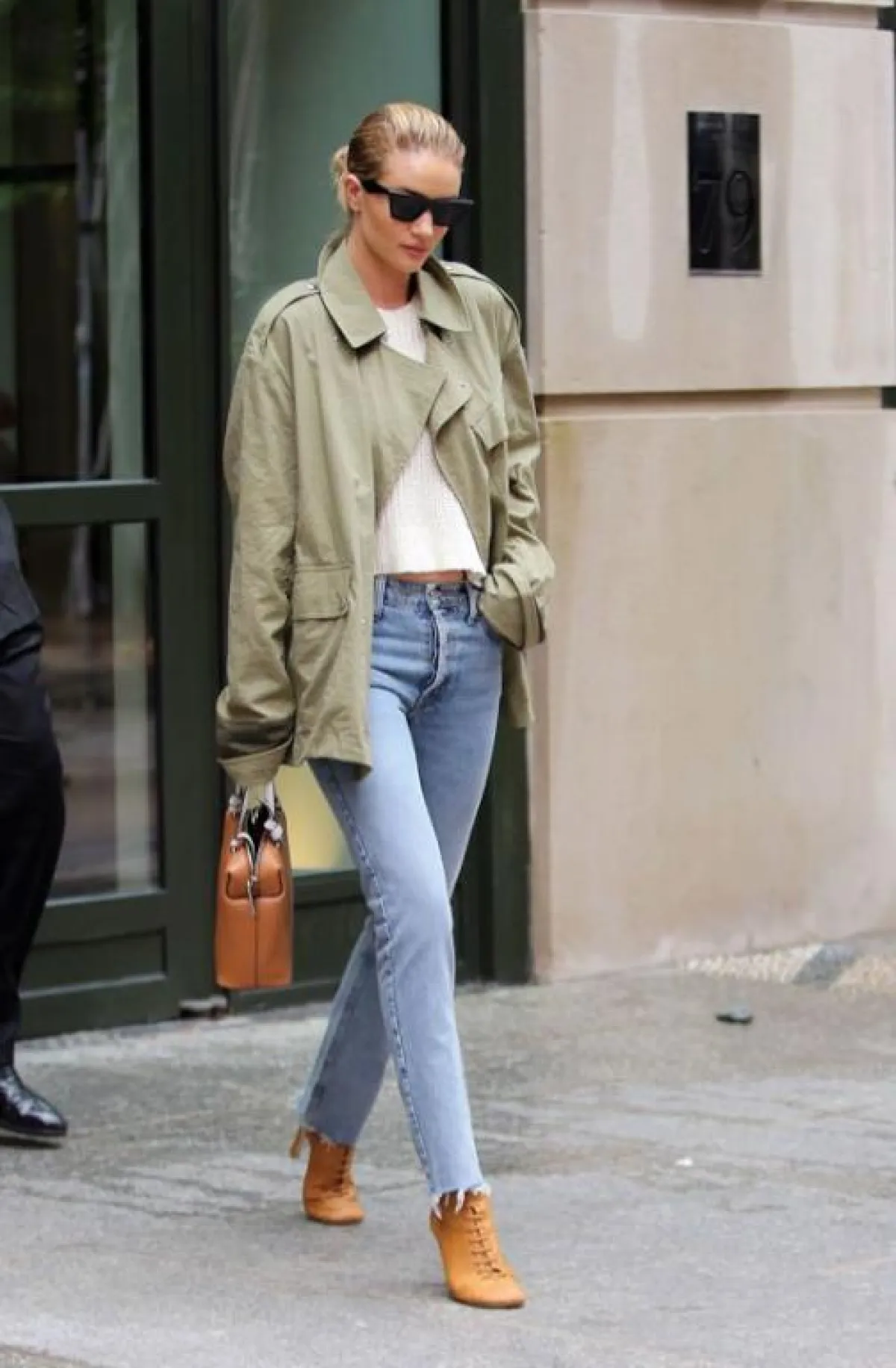 كثيراً ما نشاهد روزي هنتيغتون وايتلي Rosie Huntington Whiteley في إطلالات كاجوال في الجينز، لكن حتى هذه الأزياء البسيطة تقوم بتنسيقها بأسلوب شبابي وعصري، مثل هذا اللوك اليومي الذي نسقت فيه بنطلون جينز أزرق مع سويتر باللون البيج، ومن فوقهما ترانشكوت باللون الزيتي، وأكملت اللوك بحقيبة يد وحذاء كعب عالٍ باللون العسلي ونظارات شمسية باللون الأسود.