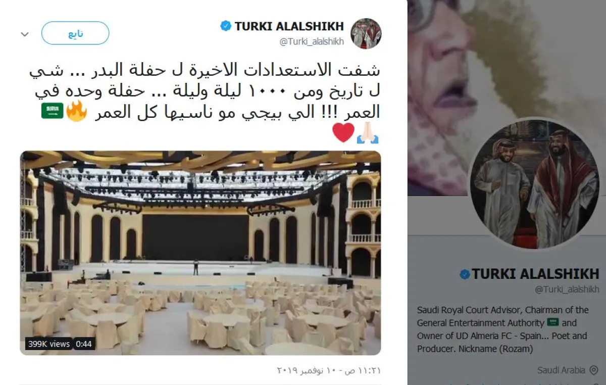 وقد غرَّد رئيس الهيئة العامة للترفيه، تركي آل الشيخ، بتغريدة عن ليلة البدر، قال فيها: "شفت الاستعدادات الأخيرة لحفلة البدر.. شيء للتاريخ.. ومن 1000 ليلة وليلة.. حفلة واحدة في العمر.. اللي بييجي مو ناسيها كل العمر".