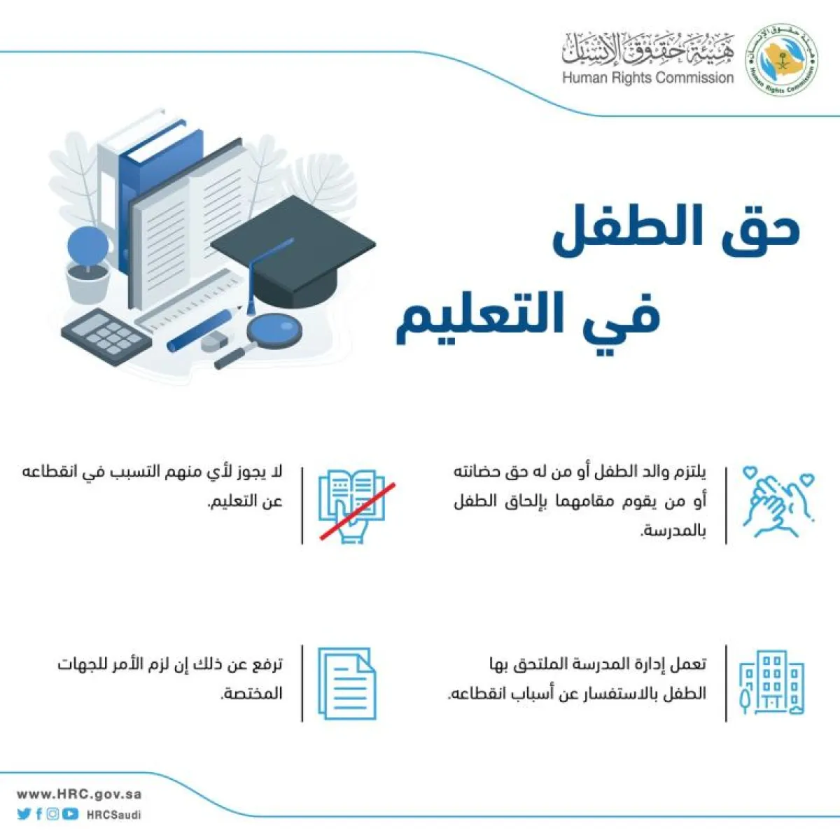 وقالت هيئة حقوق الإنسان، في تغريدة على موقع "تويتر"، إنه يجب على والد الطفل أو مَن له حق حضانته أو مَن يقوم مقامهما أن يلتزم بإلحاق الطفل بالمدرسة، وألا يتسبب في انقطاعه عن التعليم.