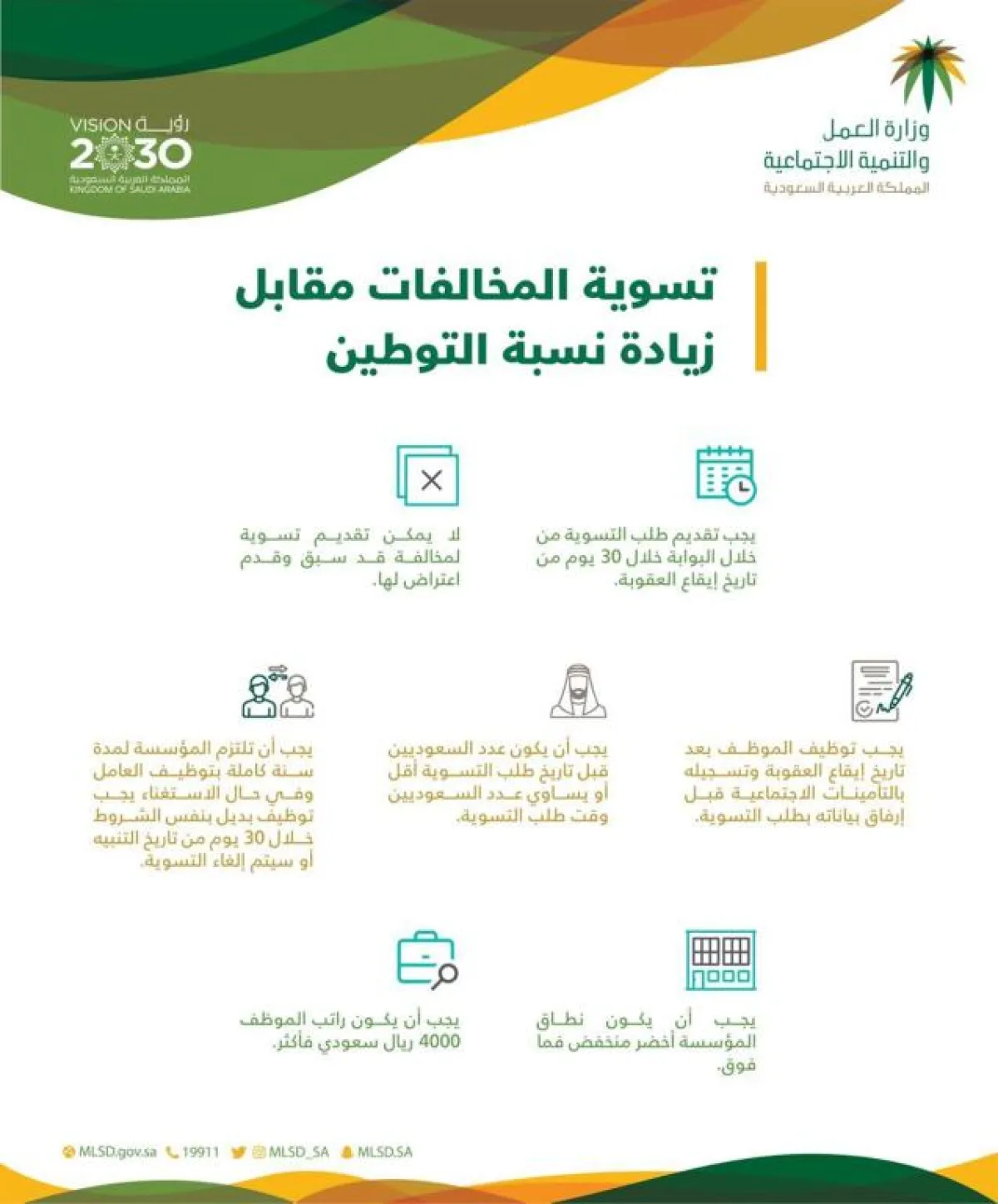 وقد حدّدت الوزارة عدداً من الشروط للاستفادة من المبادرة ومن ضمنها: أن يتقدم صاحب العمل بطلب التسوية من خلال بوابة الخدمات الإلكترونية خلال 30 يوم من تاريخ إيقاع العقوبة، وألا يكون تقديم التسوية لمخالفة قد سبق وتقدم اعتراض لها والعكس صحيح، وأن يكون نطاق المؤسسة أخضر منخفض، أخضر متوسط، أخضر مرتفع، بلاتيني لتتمكن من تقديم طلب تسوية، وأن يوظف صاحب العمل الموظف بعد تاريخ إيقاع العقوبة وتسجيله بالتأمينات الاجتماعية قبل ارفاق بياناته بطلب التسوية، وأن يكون راتب الموظف 4000 ريال سعودي فأكثر، أن تلتزم المؤسسة لمدة سنة كاملة بتوظيف العامل، وفي حال فصله يجب توظيف بديل بنفس الشروط خلال 30 يوم من تاريخ التنبيه. أو سيتم إلغاء التسوية، يجب أن يكون عدد السعوديين قبل تاريخ طلب التسوية أقل أو يساوي عدد السعوديين وقت طلب التسوية، ألا يتم استخدام نفس الموظف بأكثر من تسوية واحد للمنشأة، وأن يرد صاحب المنشاة على طلبات واستفسارات فريق التسوية بمدة لا تتجاوز 7 أيام أو سيتم إلغاء طلب التسوية آلياً.