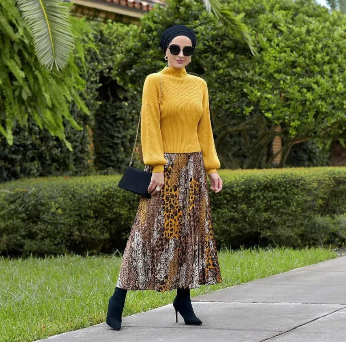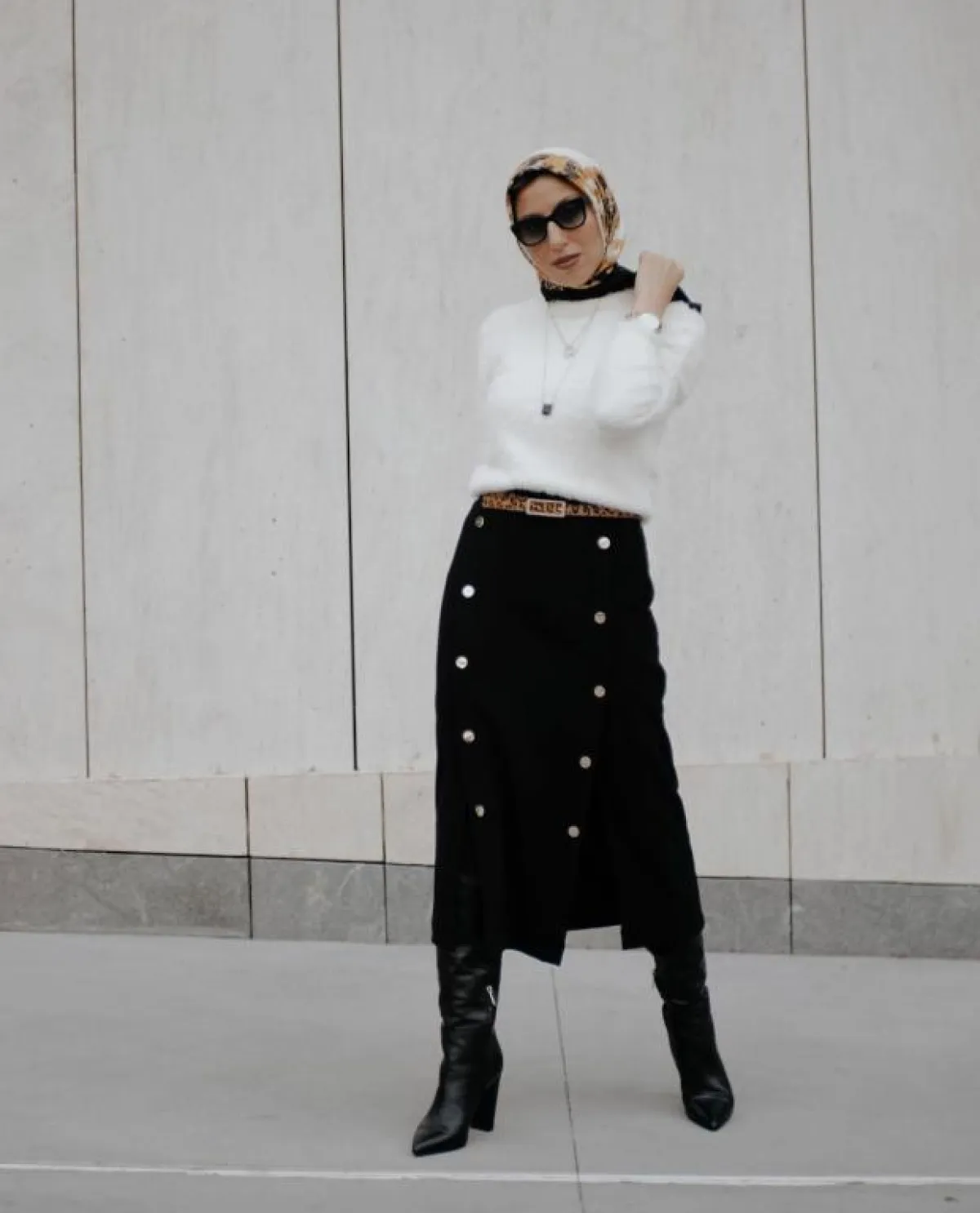 لا تترددي في اعتماد صيحة التنانير متوسطة الطولMidi skirts، اختاري موديل مستقيم بقصة الـ Wrap من وحي اطلالة الفاشينيستا ميلانيا الترك، ونسقيه مع بوت أسود طويل من اللون نفسه، وكنزة صوف بيضاء وزيني الخصر بحزام رفيع بطبعة جلد النمر.