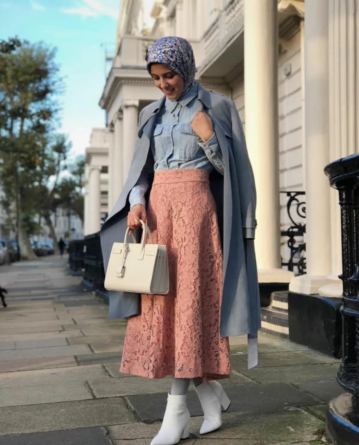 جربي تنسيق التنورة الدانتيل في اطلالتكِ النهارية، اختاري موديل واسعًا باللون الوردي المبودر، ولائميه مع قميص جينز فاتح ومعطف خفيف من لون القميص نفسه، وأكملي اللوك بانتعال بوت أبيض قصير وأحملي حقيبة Tote متوسطة الحجم.