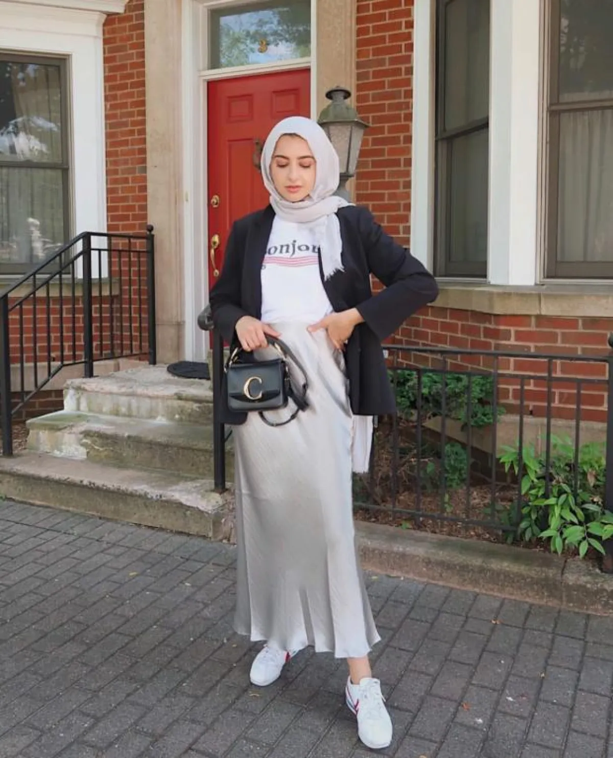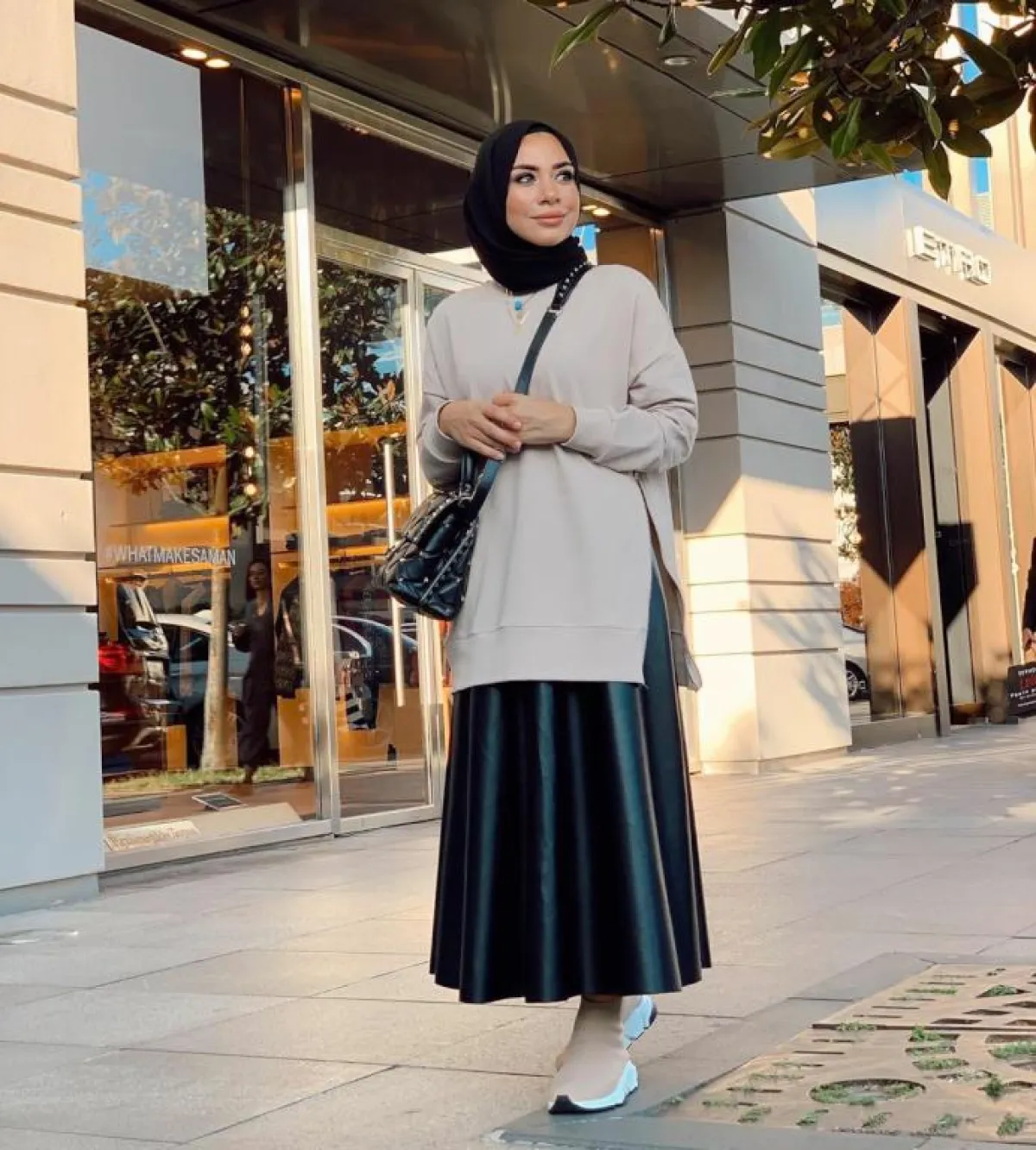 برزت هذا العام موضة الفساتين والتنانير الساتان، اعتمدي تنورة طويلة باللون الرمادي، مع تيشيرت أبيض مطبع وبليزر أسود قصير على طريقة الفاشينيستا سمر البرشا، وأكملي اللوك بحذاء سنيكرز مريح.