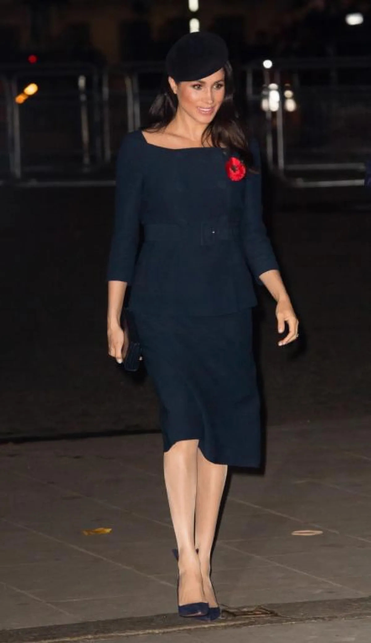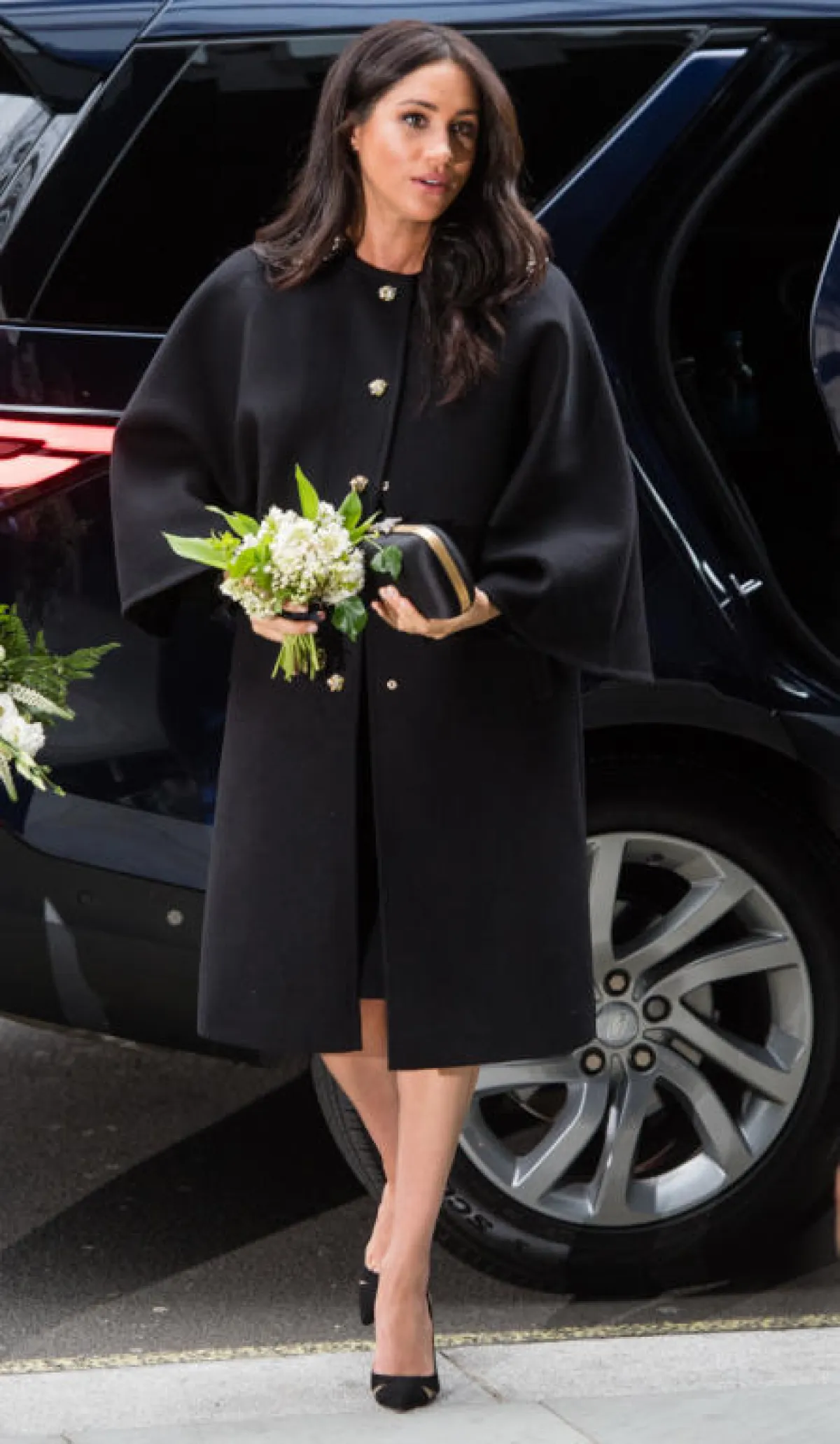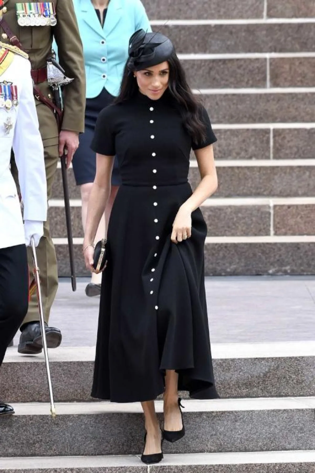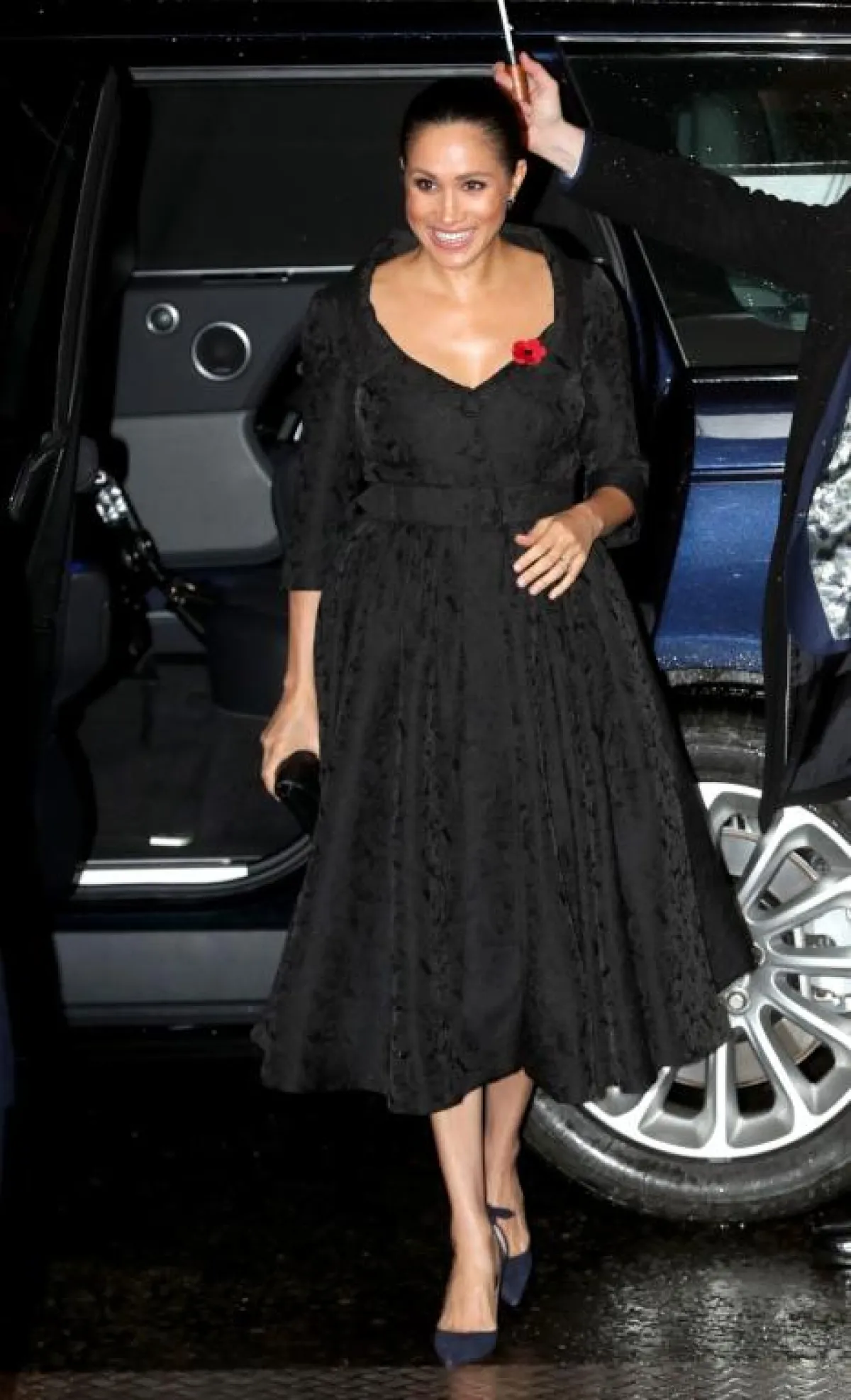 في مناسبة رسمية خاصة بالعائلة الملكية حدثت مؤخرًا في لندن، شاهدنا ميغان ماركل Meghan Markle في اطلالة راقية باللون الأسود استوحتها من حقبة الخمسينيات، وبدت فيها غاية في الأناقة، وقد كانت عبارة عن فستان ميدي من إردم Erdem بقصة محددة الخصر من خلال حزام قماشي وتنورة كلوش وصل طولها أسفل حد الركبة، وقد نسقت معه حذاءً بكعب عالٍ وحقيبة كلاتش بحجم صغير.